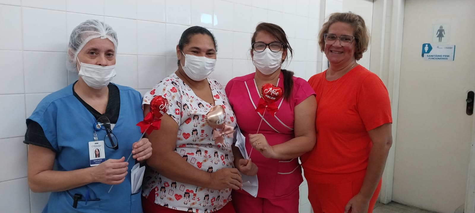 Com o apoio da diretoria-executiva da unidade hospitalar, foram distribuídos às mamães colaboradoras um mini balão, em formato de coração com o nome Mãe escrito e um lacinho, como uma pequena lembrança.