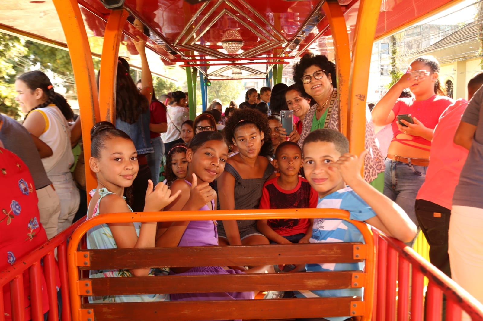 Legenda: Alunos da rede municipal de ensino se divertem num passeio na Trenzinho da Alegria.