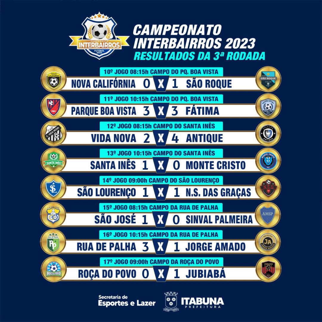 O campo do Santa Inês concentrou o maior público da 3ª rodada do Campeonato Interbairros de Futebol, promovido pela Prefeitura de Itabuna, por intermédio da Secretaria de Esportes e Lazer. Segundo integrantes da Comissão Técnica mais de 1.500 pessoas prestigiaram as duas partidas e assistiram Vida Nova 2 x 4 Antique e Parque Boa Vista 3 x3 Fátima.