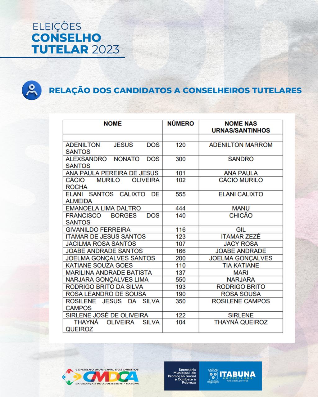 Para ter acesso às urnas será necessário apresentar Título de Eleitor e documento original de identificação com foto. Cada eleitor poderá votar em apenas um candidato ao conselho tutelar. Em Itabuna, serão eleitos 10 novos conselheiros titulares e 10 suplentes, que terão mandatos de quatro anos (2024-2027). A posse dos novos conselheiros está programada para o dia 10 de janeiro de 2024.