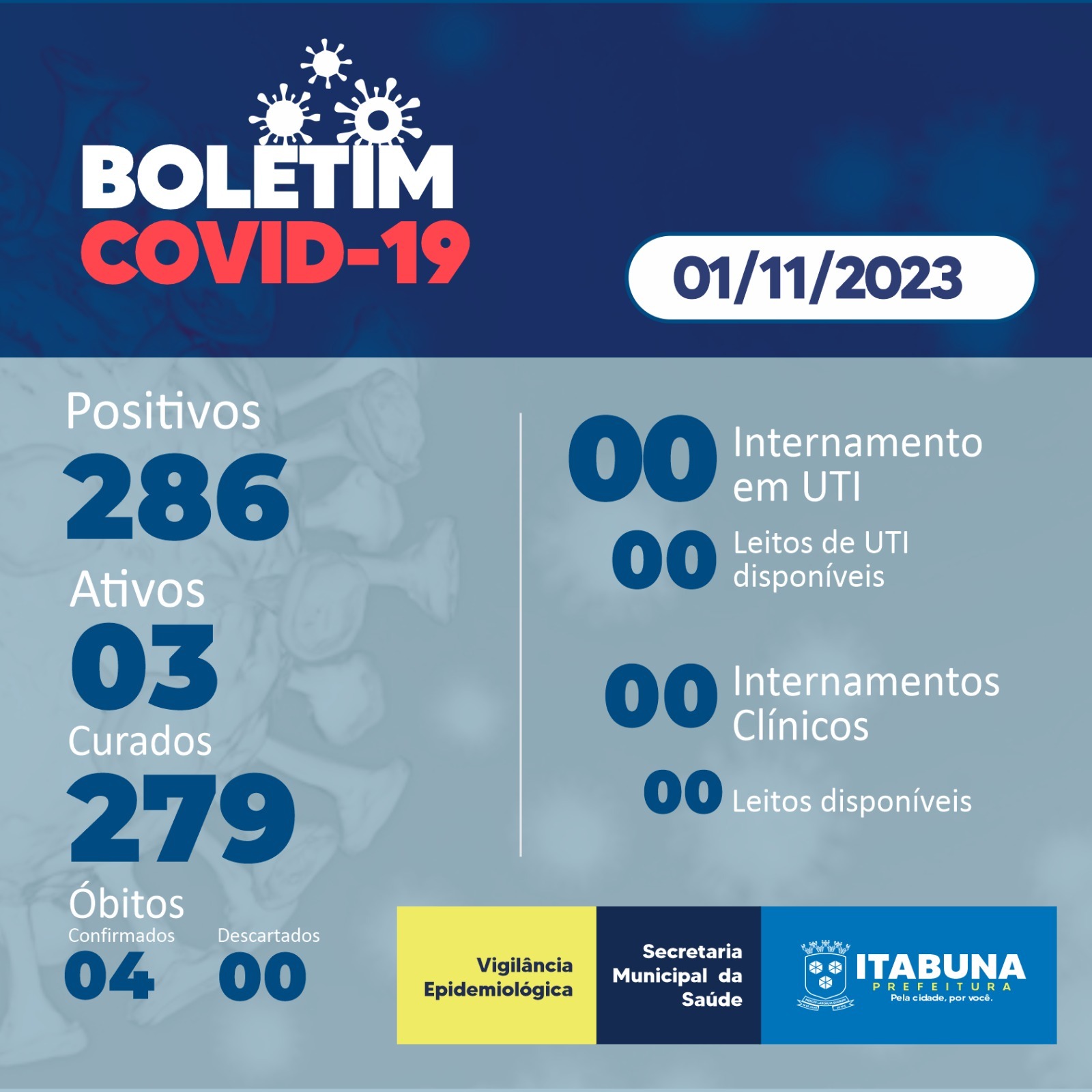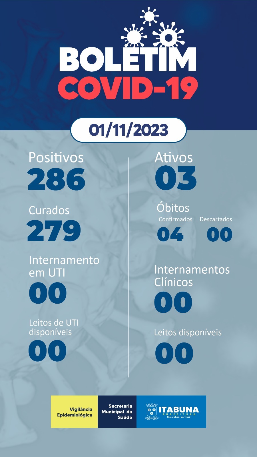 A Divisão de Vigilância Epidemiológica do Departamento de Vigilância em Saúde da Secretaria Municipal de Saúde divulgou o Boletim do Covid-19 na quarta-feira passada, dia 1°. De acordo com os dados, Itabuna registra 279 pacientes curados, 286 confirmados, sendo 03 casos ativo; leitos em UTI ocupados 00; leitos de UTI disponíveis 00; internados em leitos clínicos 00; leitos clínicos disponíveis, 00; óbitos confirmados, 04, e óbitos descartados, 00. Os óbitos inseridos a cada boletim correspondem aqueles que ocorreram em dias anteriores e estavam sob investigação, não tendo, necessariamente, ocorrido nas últimas 24 h.