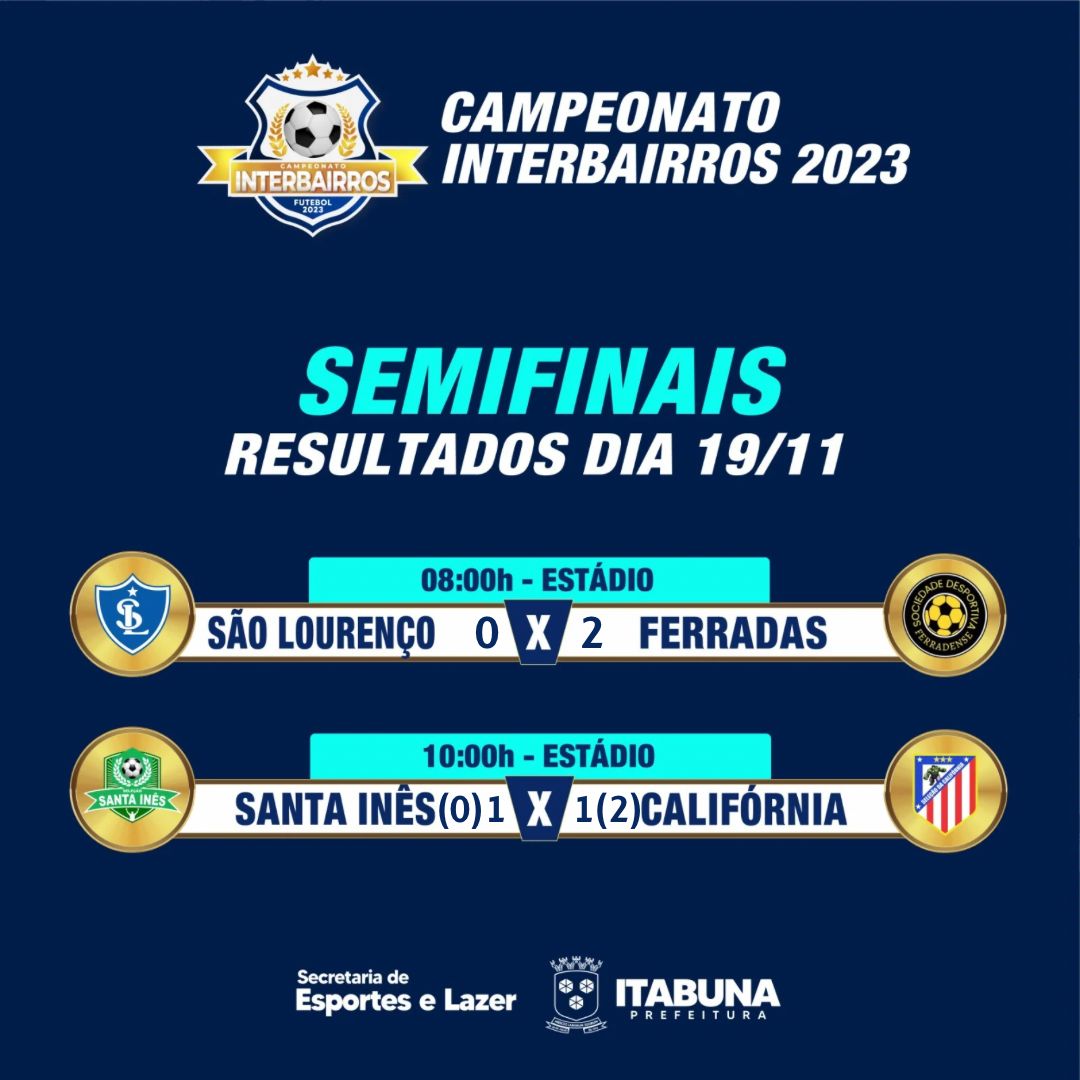 As seleções de Ferradas e Califórnia vão disputar o título do Campeonato Interbairros de Futebol 2023 no próximo domingo, dia 26, no Estádio Fernando Gomes Oliveira. Os dois times foram os vencedores das semifinais nas partidas da manhã de ontem assistidas por mais de quatro mil pessoas que lotaram as arquibancadas do Itabunão, em clima de festa, alegria e muita paz entre os torcedores.