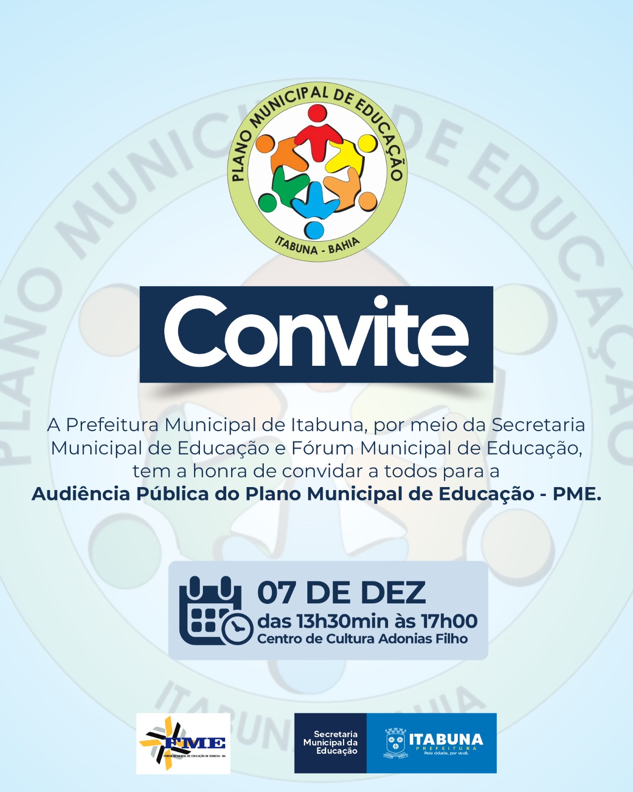A Prefeitura de Itabuna, por meio da Secretaria Municipal da Educação, promove nesta quinta-feira, dia 7, das 13h30min às 19 horas, no Centro de Cultura Adonias Filho, a última Audiência Pública do ano sobre Plano Municipal de Educação (PME). Podem participar profissionais da educação, desde a alfabetização à pós-graduação das redes pública e particular, representantes de conselhos e movimentos sociais e o público.