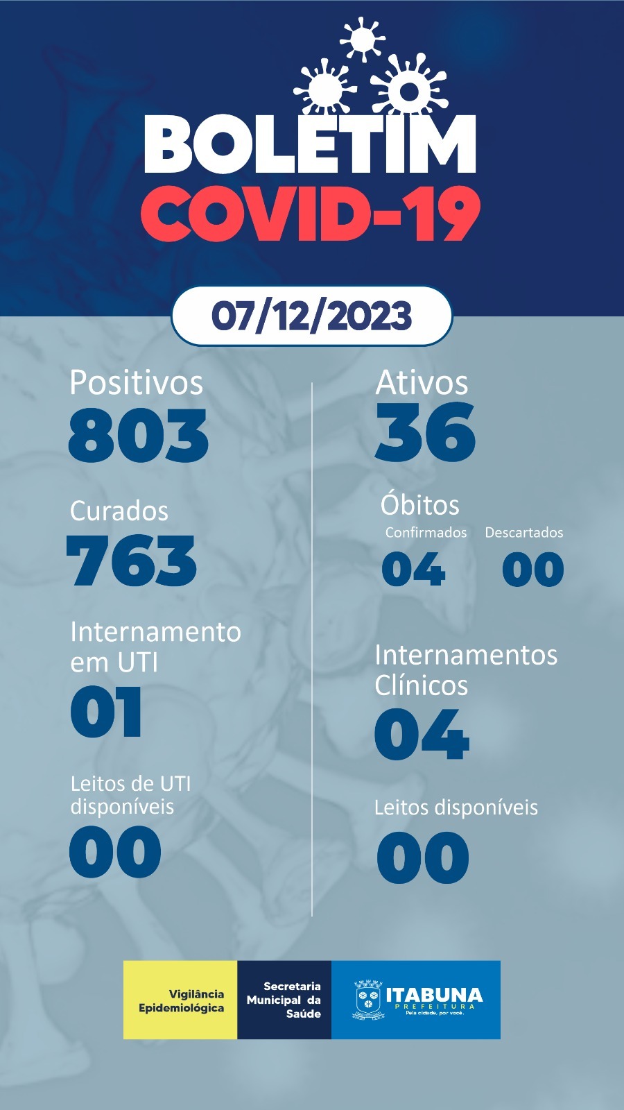 A Divisão de Vigilância Epidemiológica do Departamento de Vigilância em Saúde da Secretaria Municipal de Saúde divulgou hoje um novo Boletim do Covid-19. De acordo com os dados, Itabuna registra 763 pacientes curados,803 confirmados, sendo 36 casos ativos; leitos em UTI ocupados 01; leitos de UTI disponíveis 00; internados em leitos clínicos 04; leitos clínicos disponíveis, 00; óbitos confirmados, 04, e óbitos descartados, 00. Os óbitos inseridos a cada boletim correspondem aqueles que ocorreram em dias anteriores e estavam sob investigação, não tendo, necessariamente, ocorrido nas últimas 24 h.