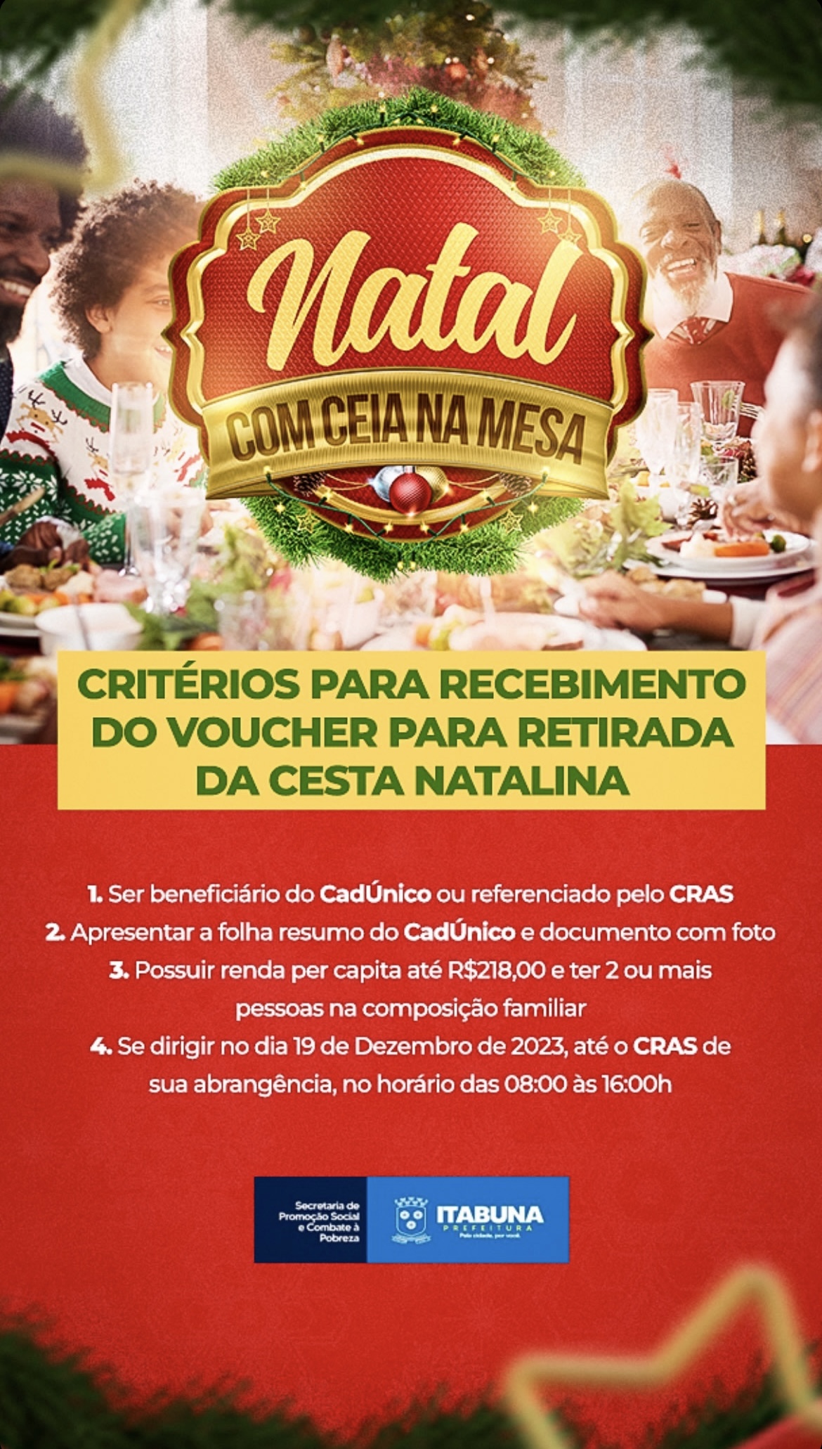 A fome é uma realidade para muitas famílias em situação de vulnerabilidade social. Para amenizar esse quadro adverso na vida de muitos itabunenses, a Prefeitura de Itabuna vai distribuir 10 mil tíquetes (vouchers) para cestas natalinas destinadas aos grupos familiares cadastrados no CadÚnico ou nos programas sociais do município ou do Governo Federal.
