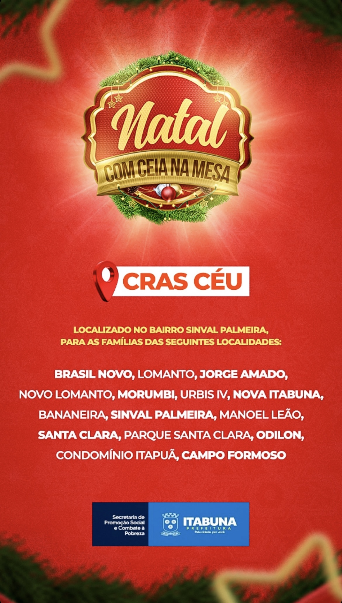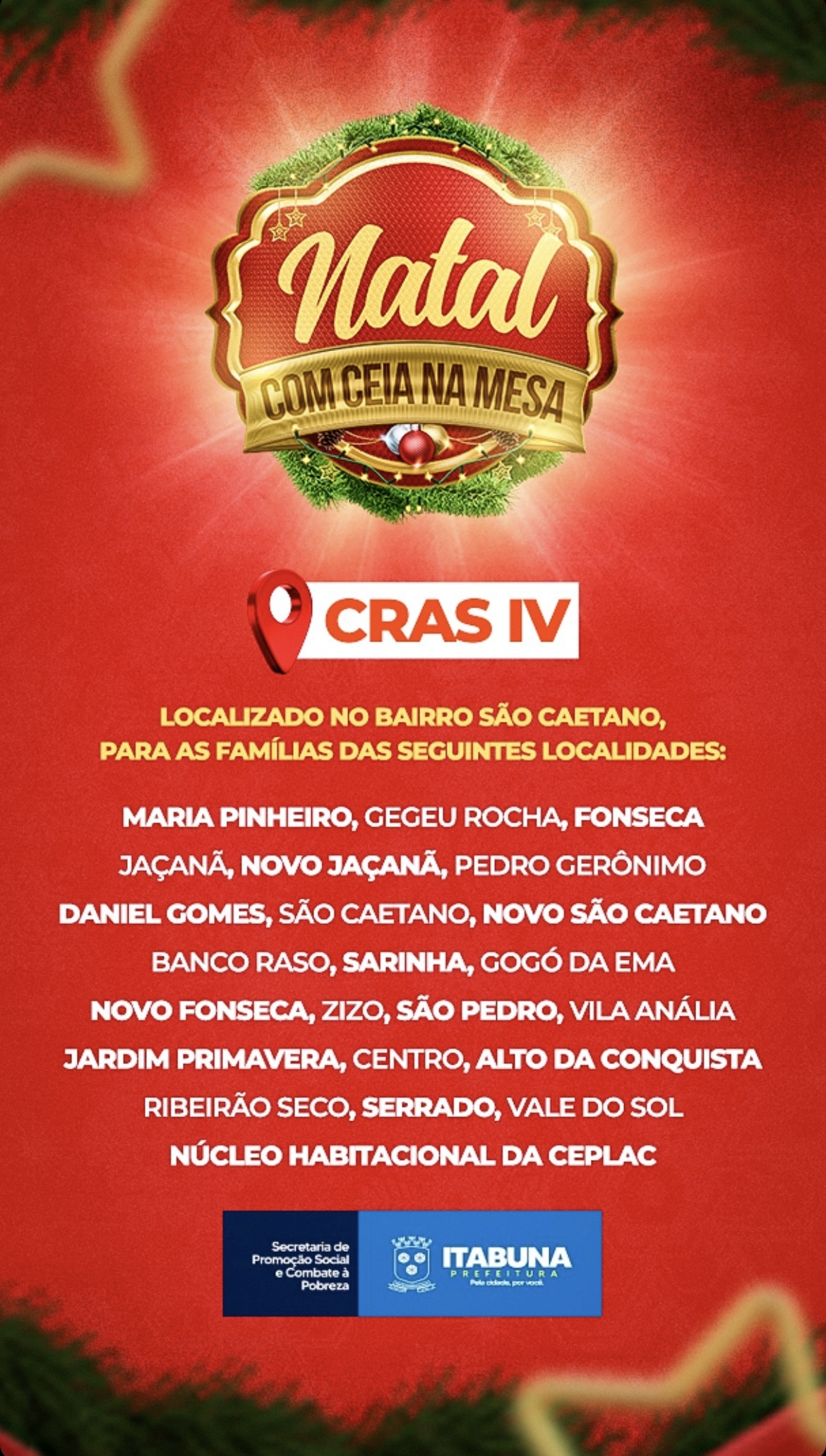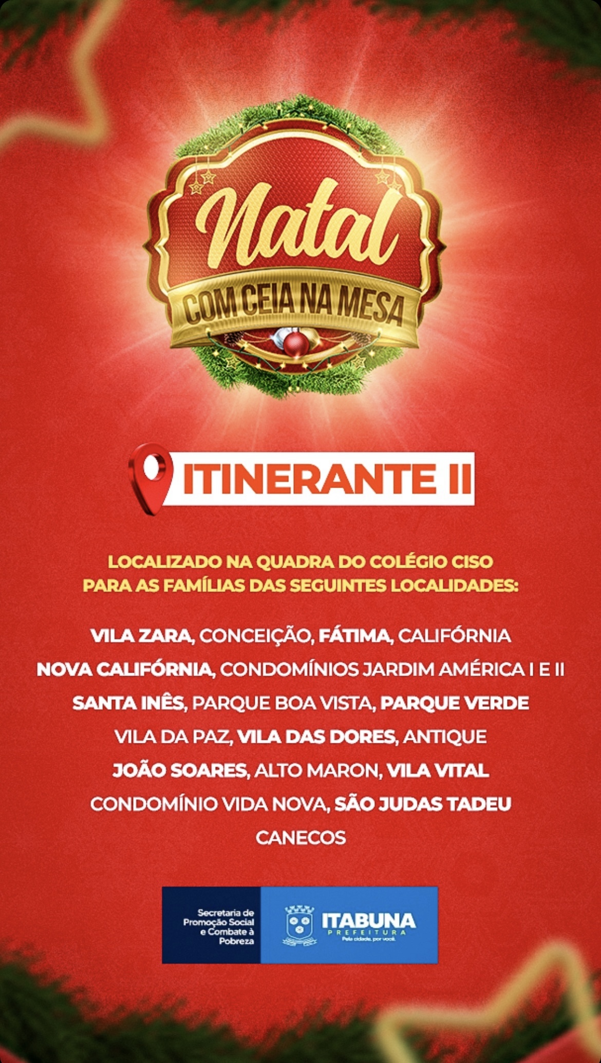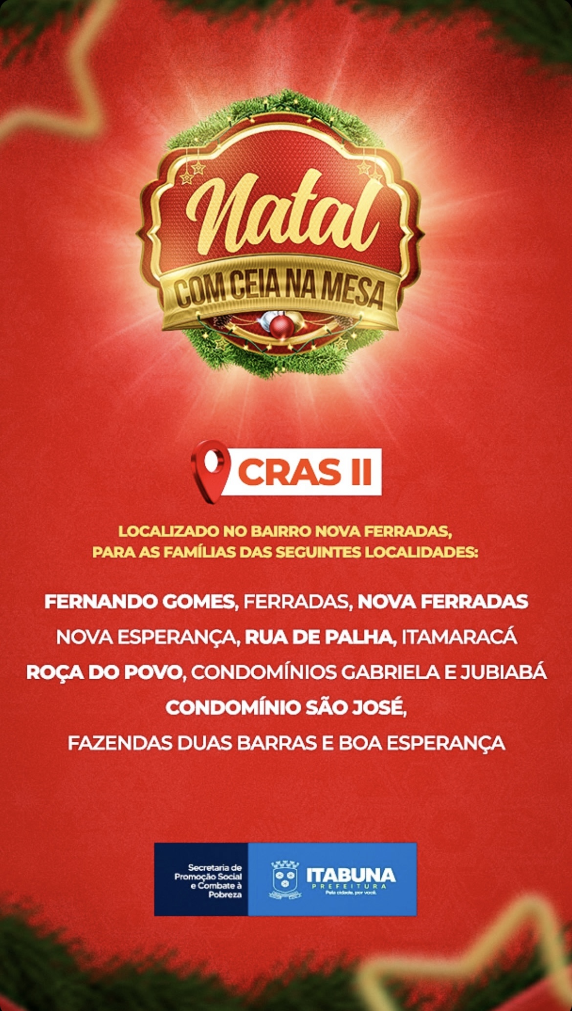 As cestas natalinas serão entregues nesta sexta feira, dia 22, a partir das 8 horas em cinco pontos de distribuição: Centro de Cultura Adonias Filho, Vila Olímpica Professor Everaldo Cardoso, Escola Lourival Oliveira Soares, em Ferradas, Escola Frederico Smith Lima, na Urbis IV, e na quadra do Colégio CISO.