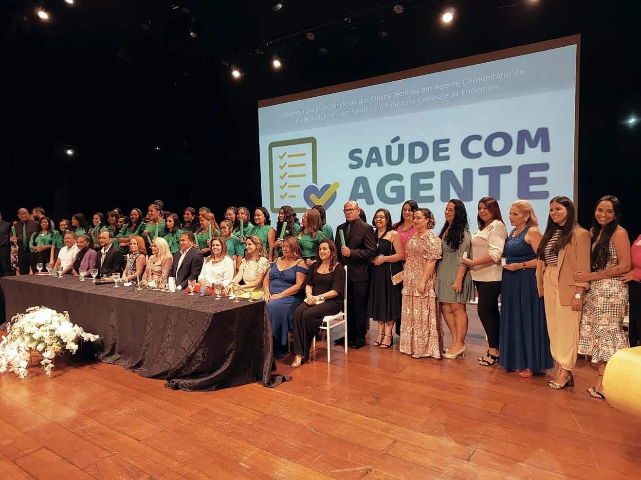 A cerimônia aconteceu no Teatro Candinha Dórea contando com a presença do prefeito Augusto Castro, da secretária municipal de Saúde, Lívia Mendes Aguiar, vereadores e familiares dos 510 agentes concluintes dos cursos, que também objetivam ampliar as habilidades de acolhimento para atendimento a populações vulneráveis, como a equidade de gênero, raça e etnia; saúde mental; e o cuidado de pessoas que fazem uso abusivo de álcool e outras drogas.