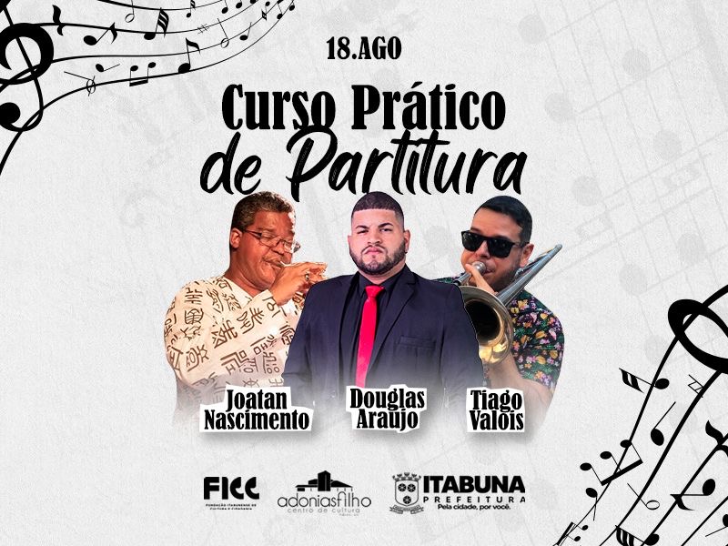A Prefeitura de Itabuna, por meio da FICC, está oferecendo um curso imperdível de Prático de Partitura no Centro de Cultura Adonias Filho, no dia 18 de Agosto, com horários de 09h às 12h e 14h às 17h30, o curso é totalmente gratuito.