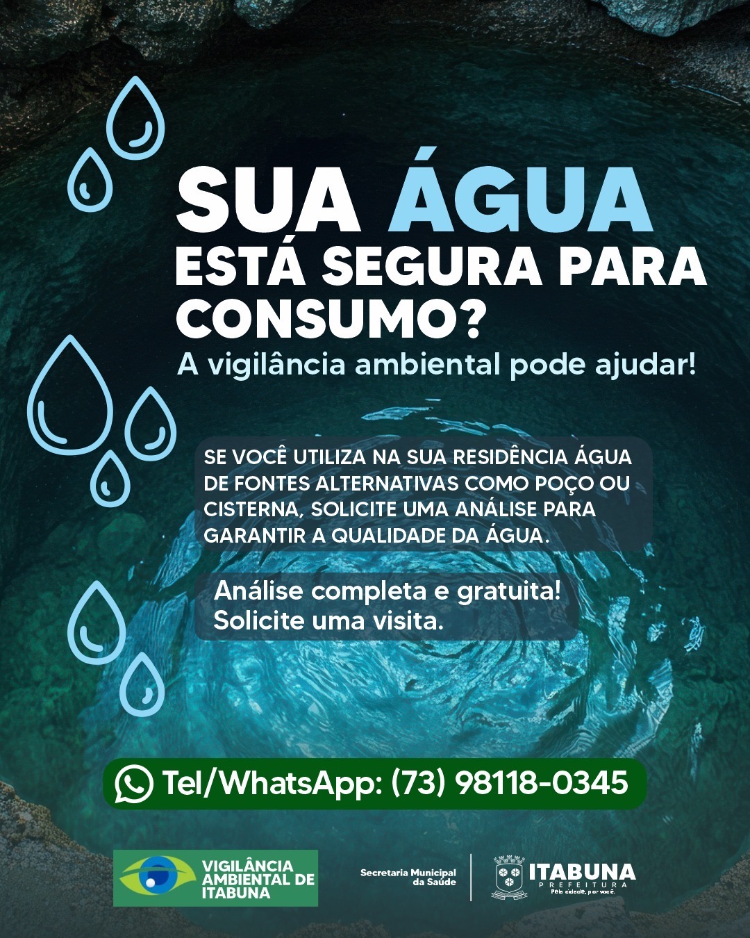 A Prefeitura de Itabuna, por meio da Divisão de Vigilância Ambiental do Departamento de Vigilância em Saúde, alerta a população quanto aos cuidados no consumo de água bruta de cisternas, poços e da chuva. A unidade da Secretaria Municipal de Saúde faz o monitoramento para prevenção de doenças como cólera, hepatite B, febre tifoide e doenças parasitárias.
