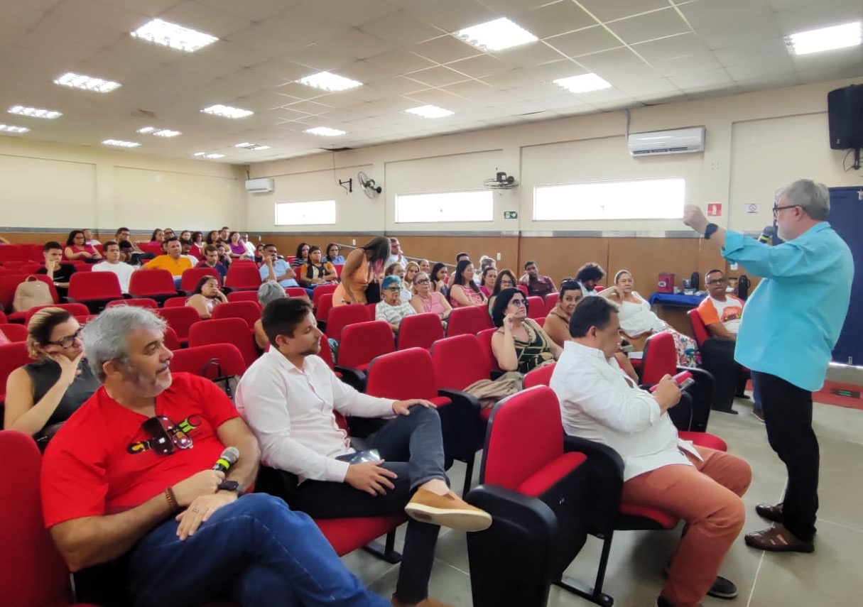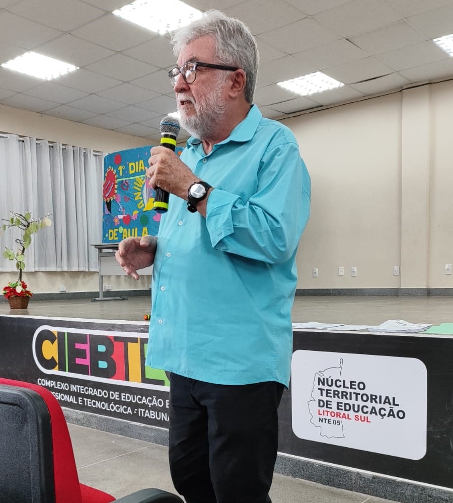 Legenda: Secretário de Agricultura e Meio Ambiente, João Carlos Oliveira da Silva, apresenta projeto na Jornada Pedagógica do CIEBTEC – Fotos Secom – Prefeitura Itabuna