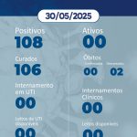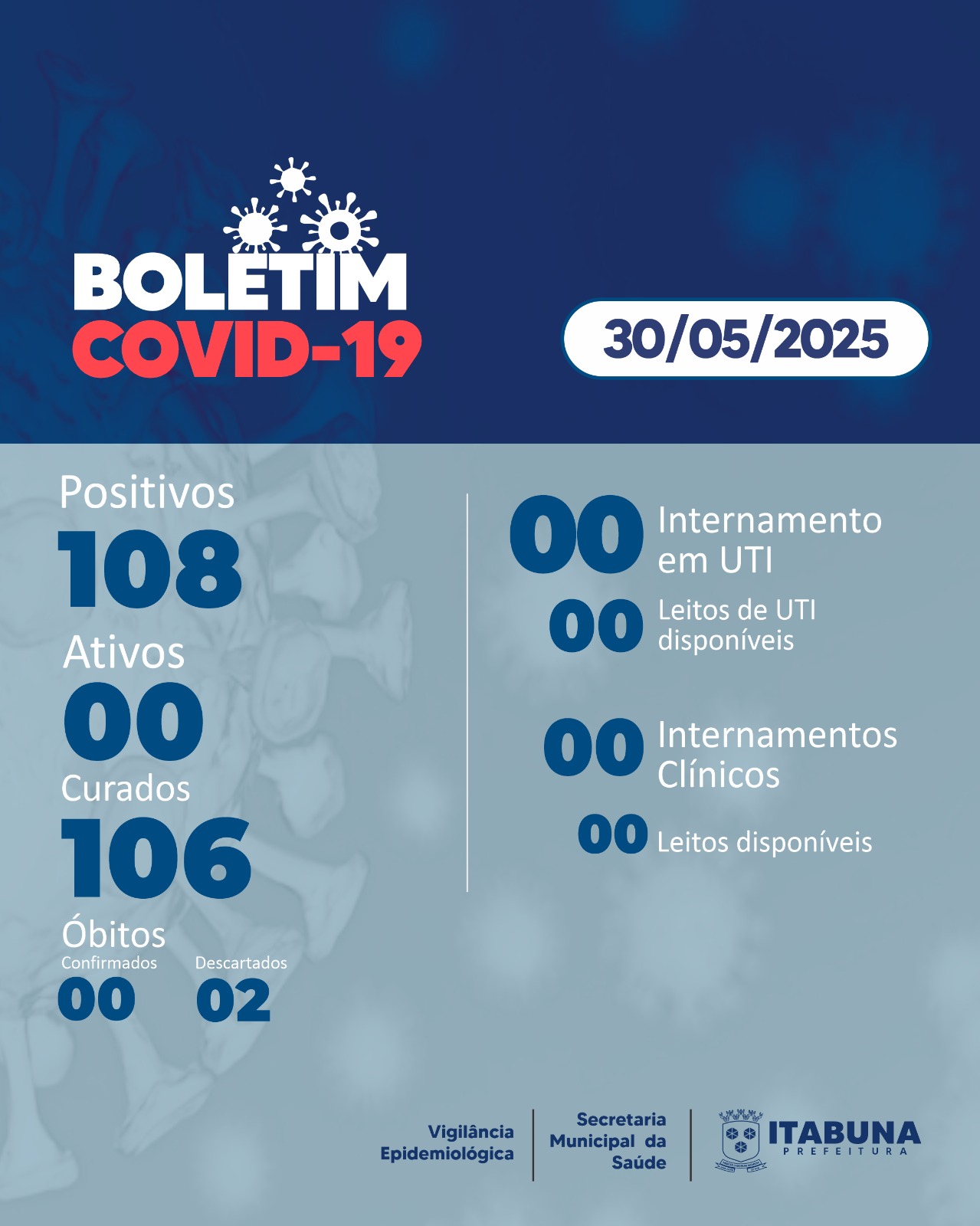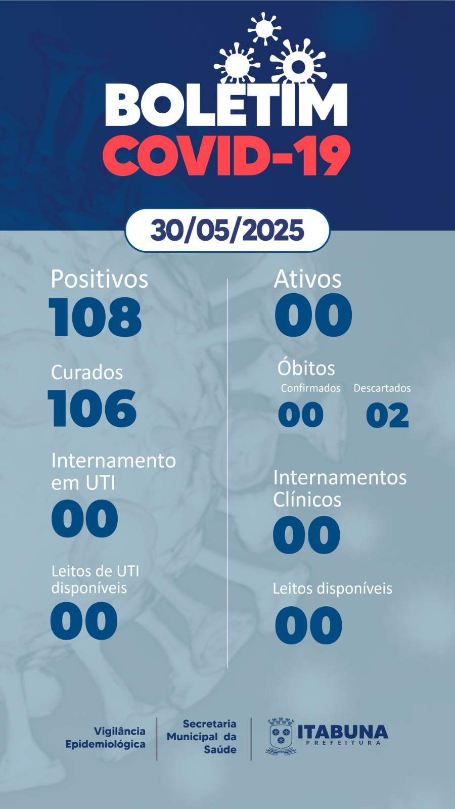 A Divisão de Vigilância Epidemiológica do Departamento de Vigilância em Saúde da Secretaria Municipal de Saúde divulgou hoje um novo Boletim do Covid-19 com base na Planilha 2024. De acordo com os dados, Itabuna registra 106 pacientes curados, 108 confirmados, sendo 00 casos ativos; leitos em UTI ocupados 00; leitos de UTI disponíveis 00; internados em leitos clínicos 00; leitos clínicos disponíveis, 00; óbitos confirmados, 00, e óbitos descartados, 02. Os óbitos inseridos a cada boletim correspondem aqueles que ocorreram em dias anteriores e estavam sob investigação, não tendo, necessariamente, ocorrido nas últimas 24h.
