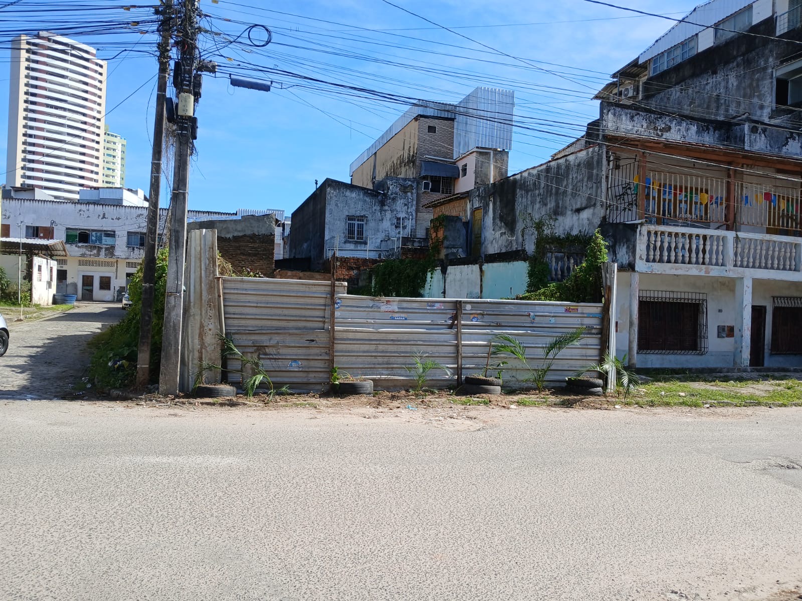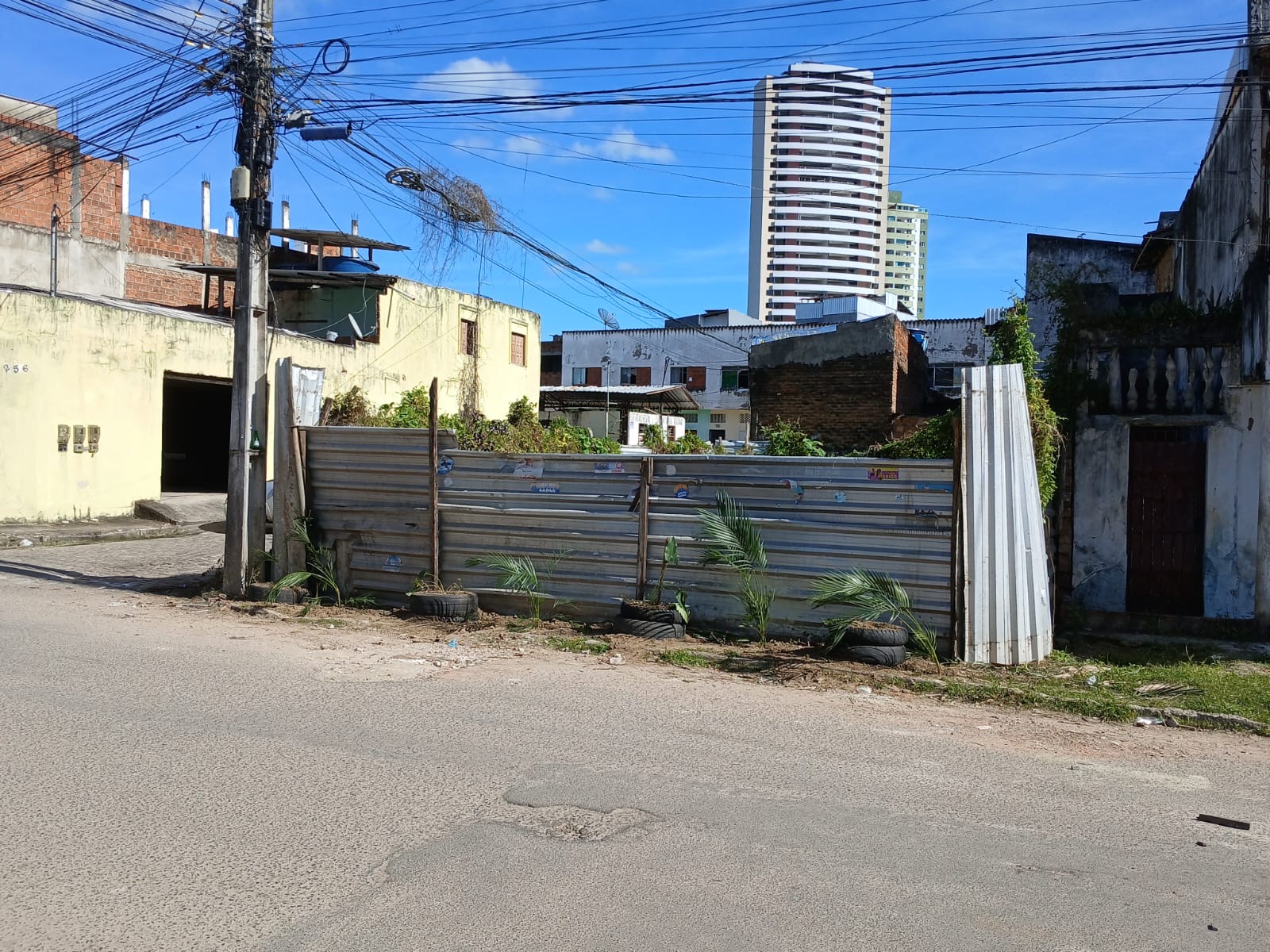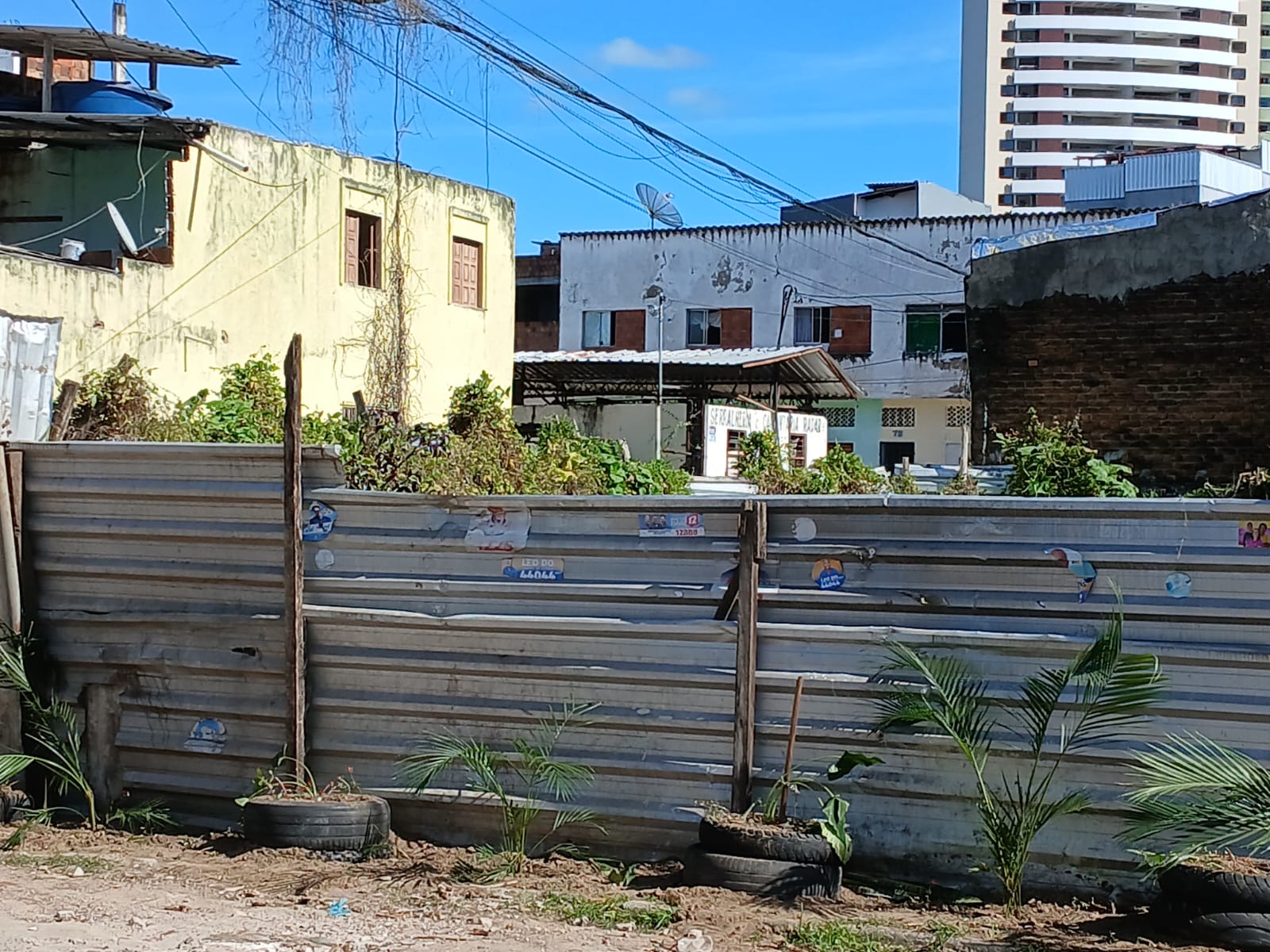 Na beira do terreno baldio, cercado de tapumes, foram colocados pneus com mudas de coqueirinhos no seu interior, ajardinando a área, num recado aos moradores: aqui não é local de descarte irregular de lixo do bairro que tem coleta domiciliar de segunda a sexta-feira.