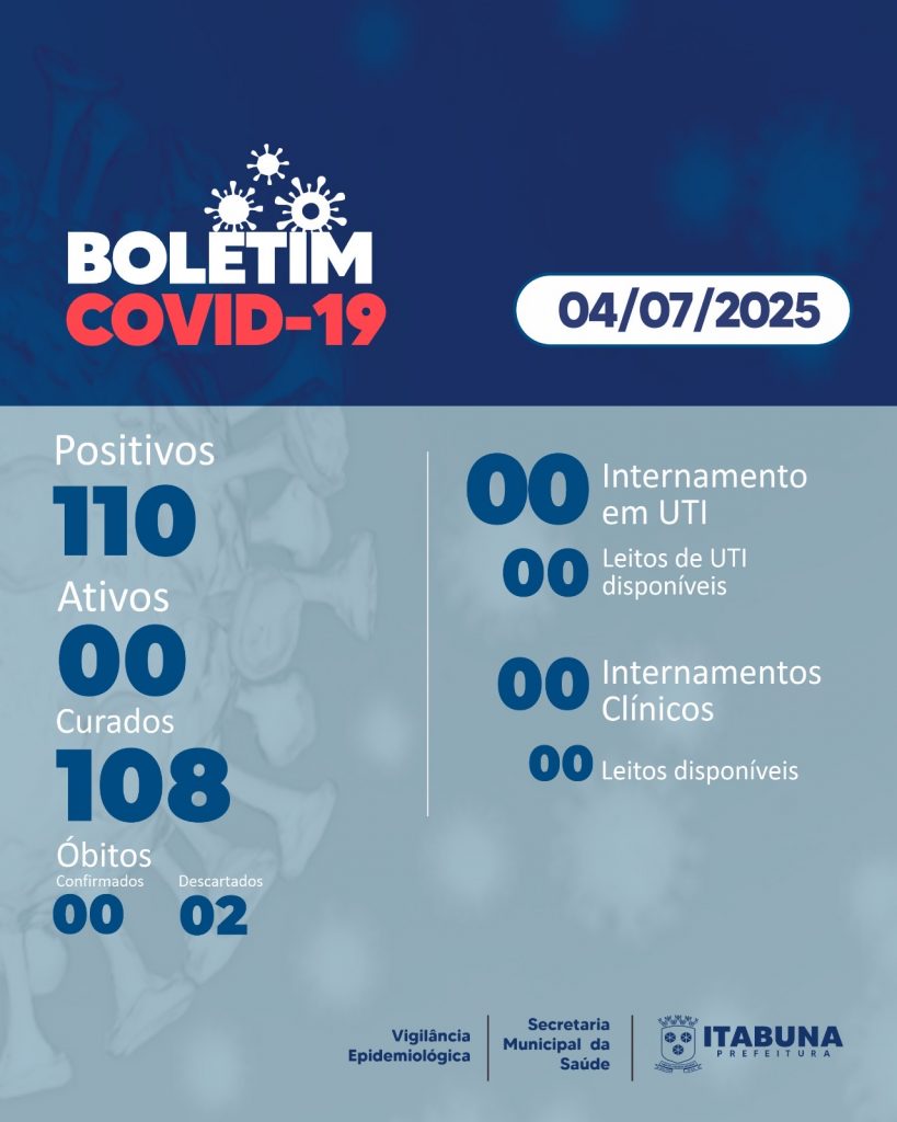 A Divisão de Vigilância Epidemiológica do Departamento de Vigilância em Saúde da Secretaria Municipal de Saúde divulgou hoje um novo Boletim do Covid-19 com base na Planilha 2024. De acordo com os dados, Itabuna registra 108 pacientes curados, 110 confirmados, sendo 00 casos ativos; leitos em UTI ocupados 00; leitos de UTI disponíveis 00; internados […]