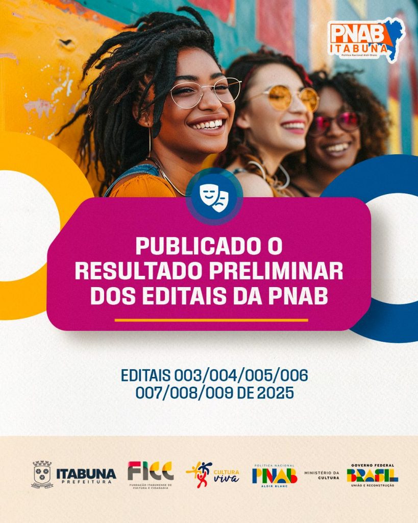 A Fundação Itabunense de Cultura e Cidadania (FICC) divulgou, nesta semana, o resultado preliminar dos editais da Política Nacional Aldir Blanc de Fomento à Cultura – PNAB, marco histórico para o setor cultural brasileiro. A iniciativa é resultado da Lei nº 14.399/2022, que estabelece uma política pública nacional voltada à valorização da cultura, em parceria com Estados, Municípios, o Distrito Federal e a sociedade civil.