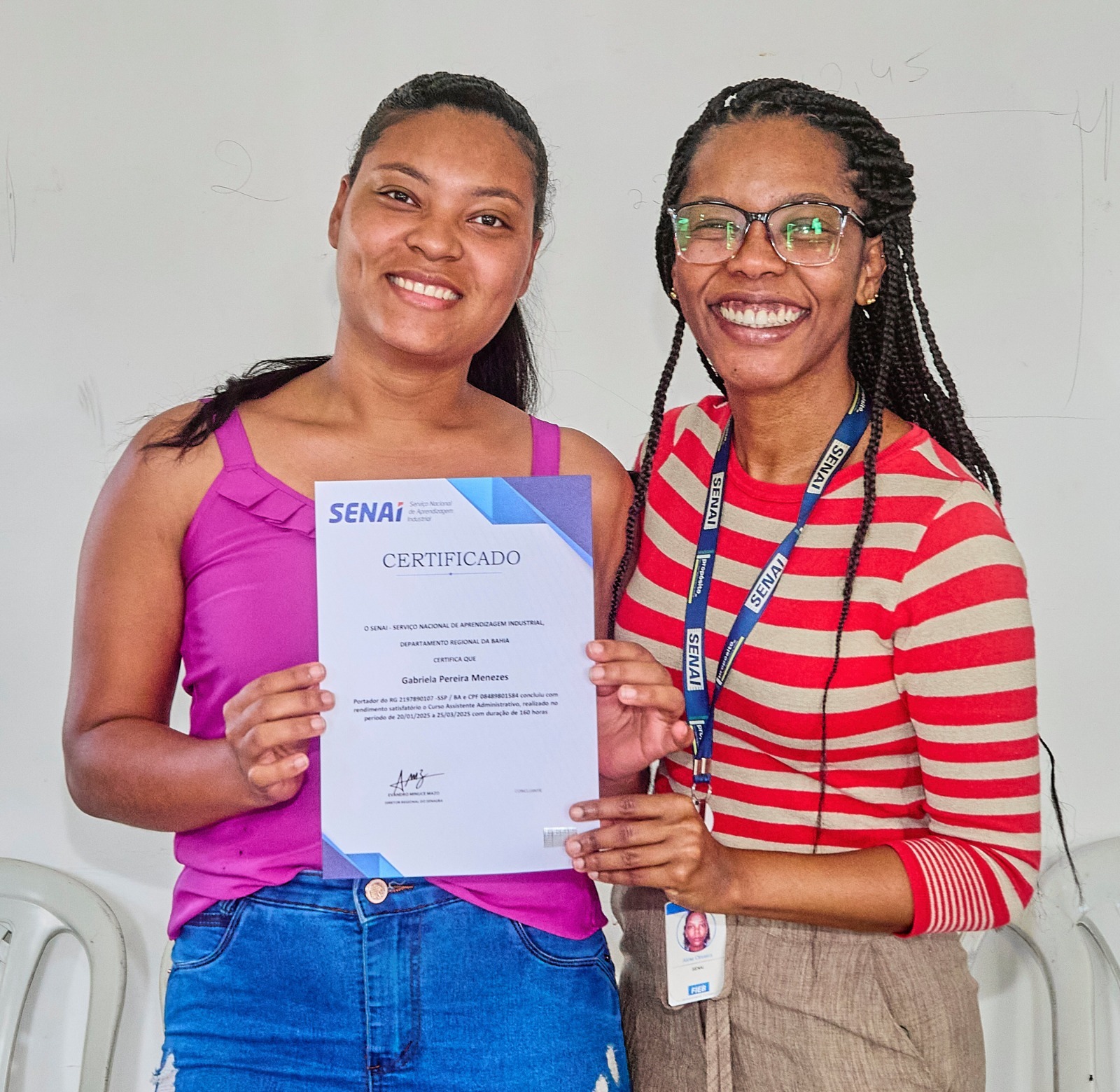 Legenda: Aluna Gabriela Pereira com Aline Madalena, do SENAI Fotos Pedro Augusto – Secom – Prefeitura Itabuna