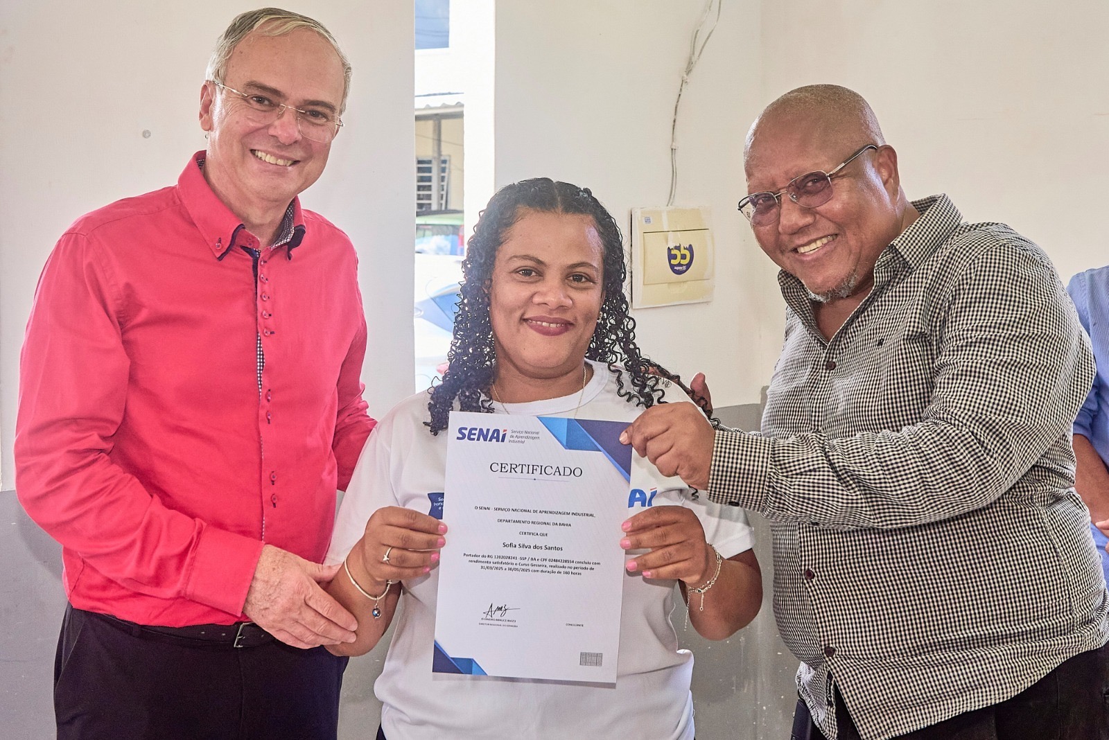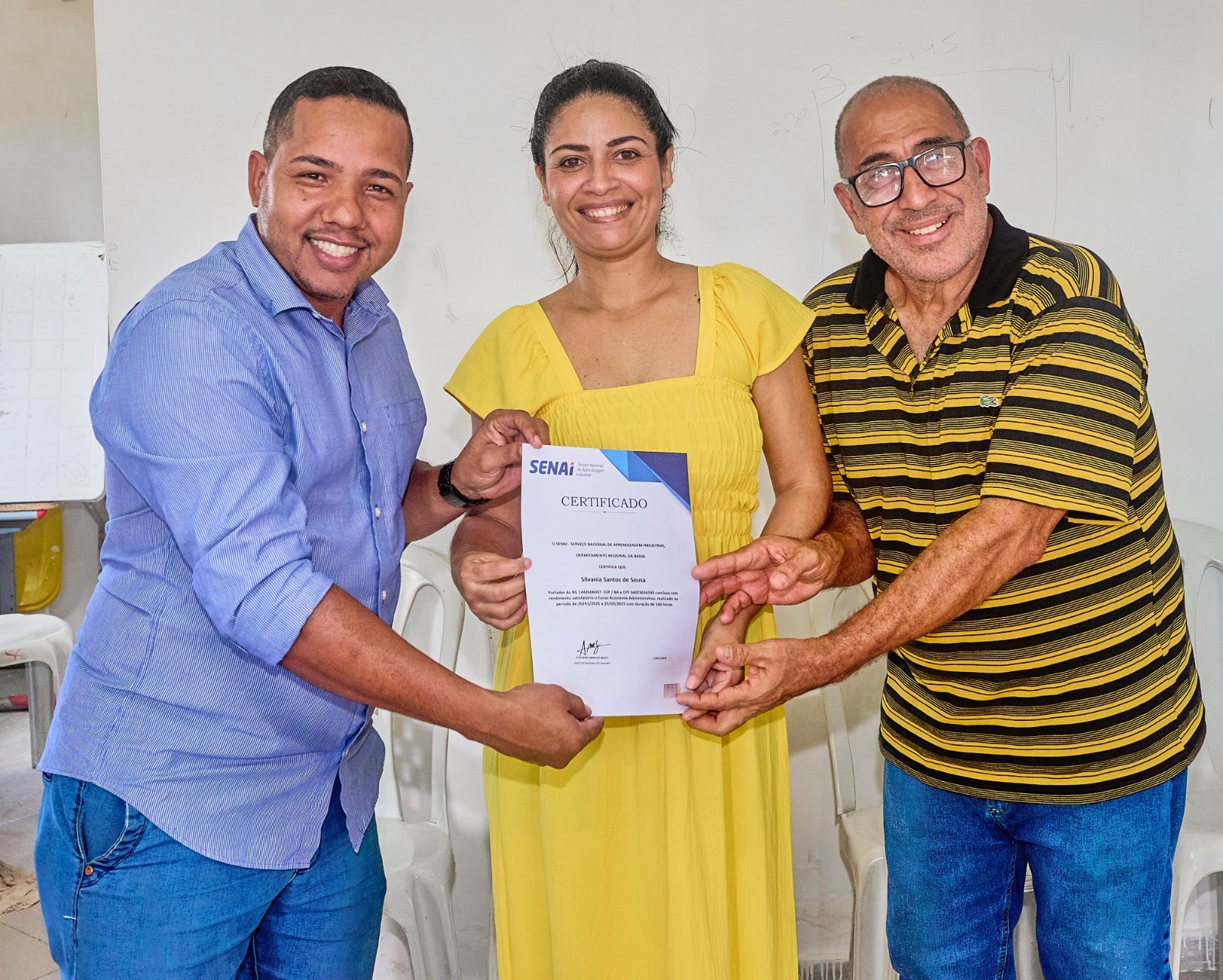 Legenda: Vereador Luizinho da Saúde, aluna Silvania Santos com Cosme Ramos, representante do Gabriela – Fotos Pedro Augusto – Secom – Prefeitura Itabuna