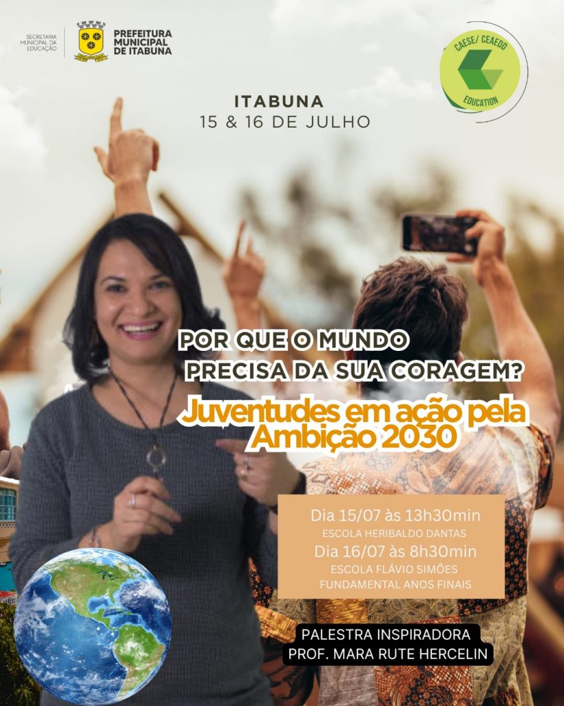 A Prefeitura de Itabuna, por meio da Coordenação do Ensino Fundamental Anos Finais – DEB da Secretaria Municipal da Educação promove um mciclo de palestras em duas escolas da Rede Municipal de Ensino. Com o tema “Por que o mundo precisa da sua coragem? Juventudes em ação pela Ambição 2030” o evento terá como palestrante a Professora Doutora Mara Rute Lima Hercelin.