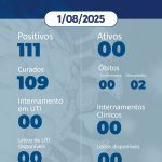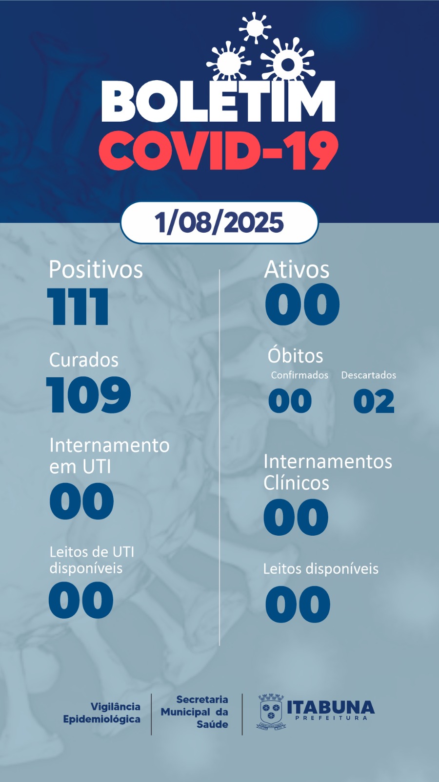 A Divisão de Vigilância Epidemiológica do Departamento de Vigilância em Saúde da Secretaria Municipal de Saúde divulgou hoje um novo Boletim do Covid-19 com base na Planilha 2024. De acordo com os dados, Itabuna registra 109 pacientes curados, 111 confirmados, sendo 00 casos ativos; leitos em UTI ocupados 00; leitos de UTI disponíveis 00; internados em leitos clínicos 00; leitos clínicos disponíveis, 00; óbitos confirmados, 00, e óbitos descartados, 02. Os óbitos inseridos a cada boletim correspondem aqueles que ocorreram em dias anteriores e estavam sob investigação, não tendo, necessariamente, ocorrido nas últimas 24h.