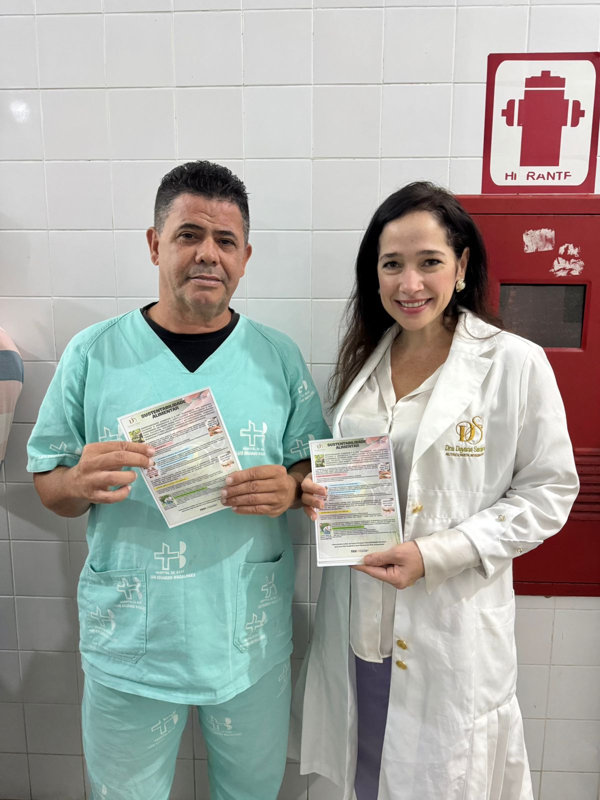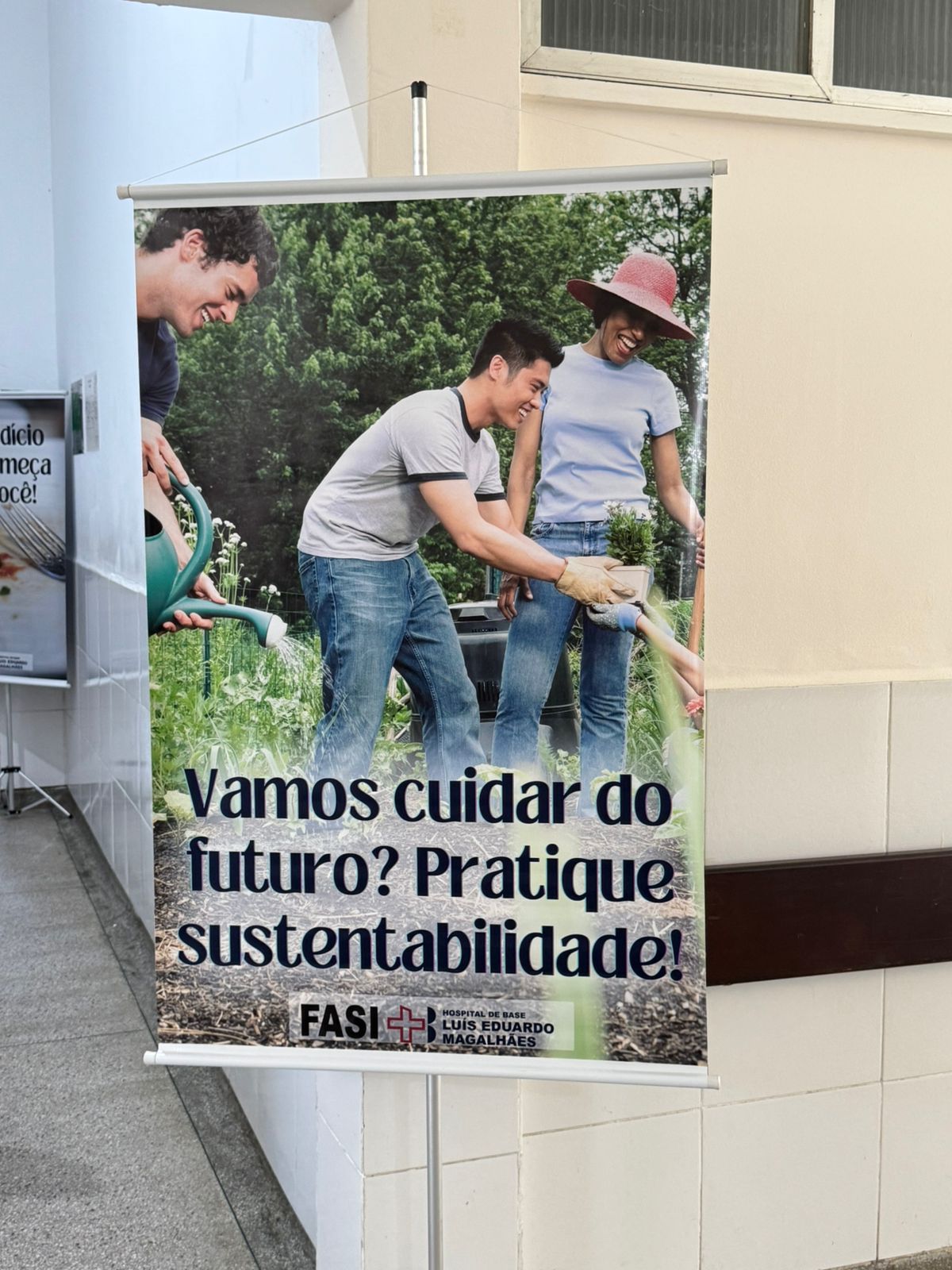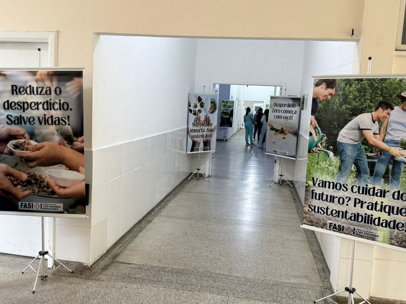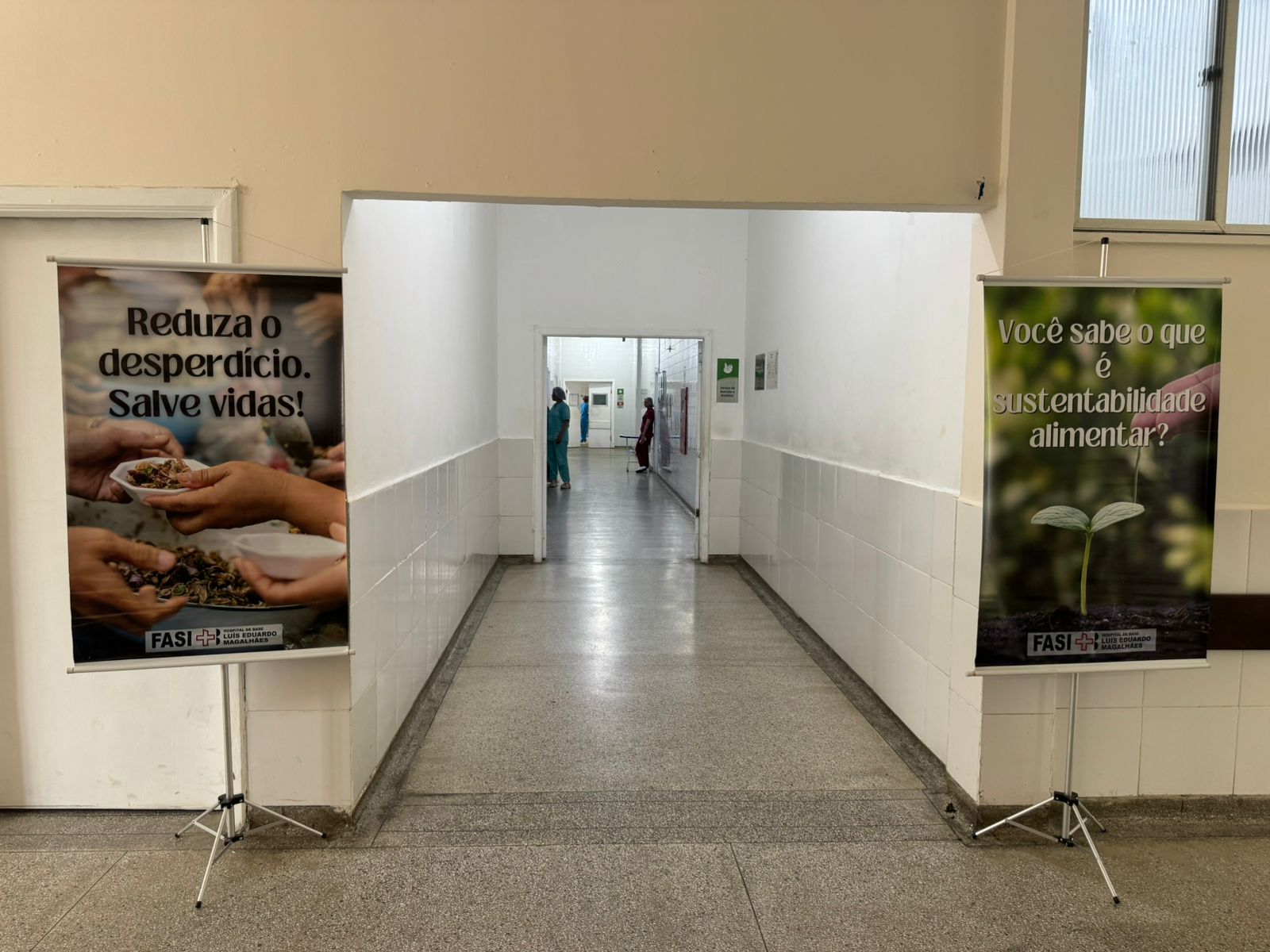 A ação aconteceu no corredor de entrada da nutrição hospitalar e no refeitório, com a exposição de banners informativos, exibição de vídeo educativo com orientações práticas e distribuição de panfletos com dicas para reduzir o desperdício de alimentos.