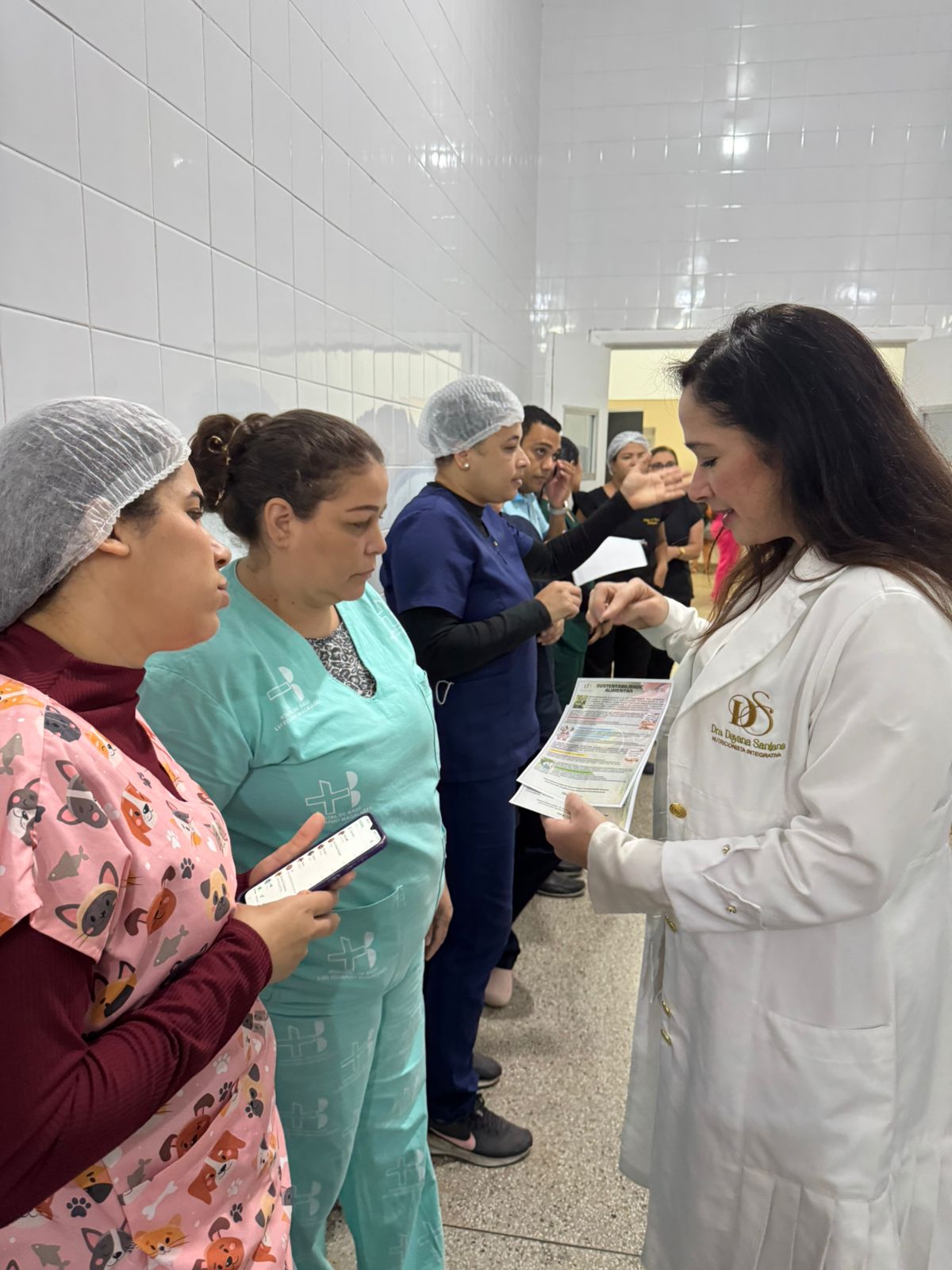 Legenda: Consultora nutricional, Dayana Santana, na distribuição de panfletos no corredor do refeitório sobre o tema – Fotos Divulgação.