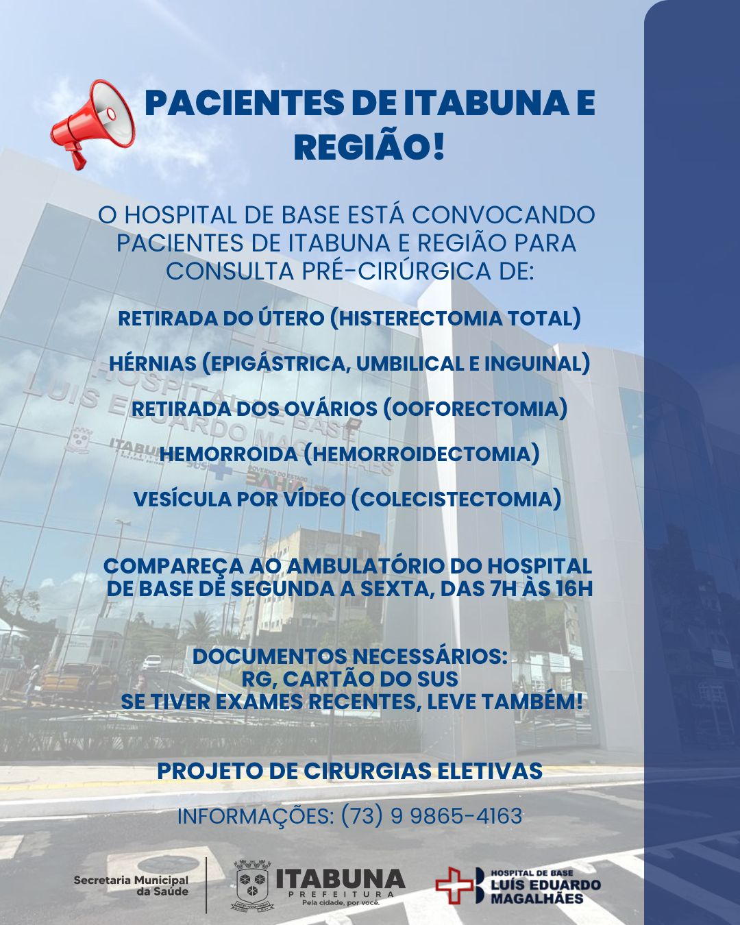 O Hospital de Base Luís Eduardo Magalhães, administrado pela Fundação de Atenção à Saúde de Itabuna (FASI), está convocando pacientes de Itabuna e região para consulta pré-cirúrgica no Ambulatório da unidade hospitalar.