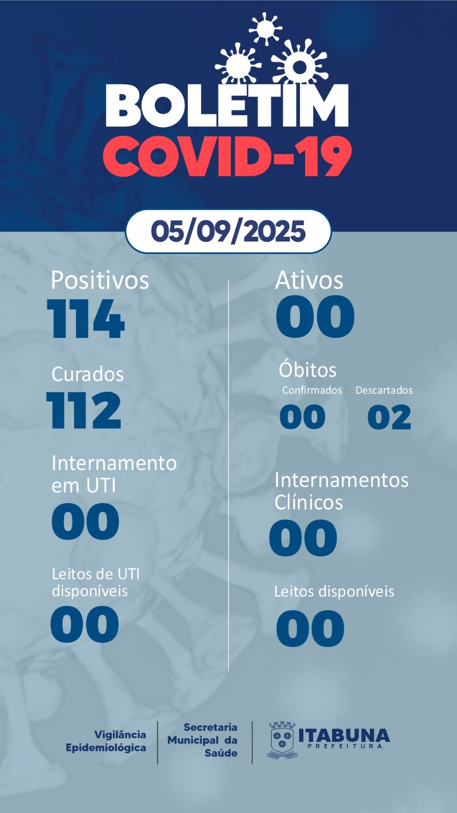 A Divisão de Vigilância Epidemiológica do Departamento de Vigilância em Saúde da Secretaria Municipal de Saúde divulgou hoje um novo Boletim do Covid-19 com base na Planilha 2024. De acordo com os dados, Itabuna registra 112 pacientes curados, 114 confirmados, sendo casos ativos; leitos em UTI ocupados 00; leitos de UTI disponíveis 00; internados em leitos clínicos 00; leitos clínicos disponíveis, 00; óbitos confirmados, 00, e óbitos descartados, 02. Os óbitos inseridos a cada boletim correspondem aqueles que ocorreram em dias anteriores e estavam sob investigação, não tendo, necessariamente, ocorrido nas últimas 24h.