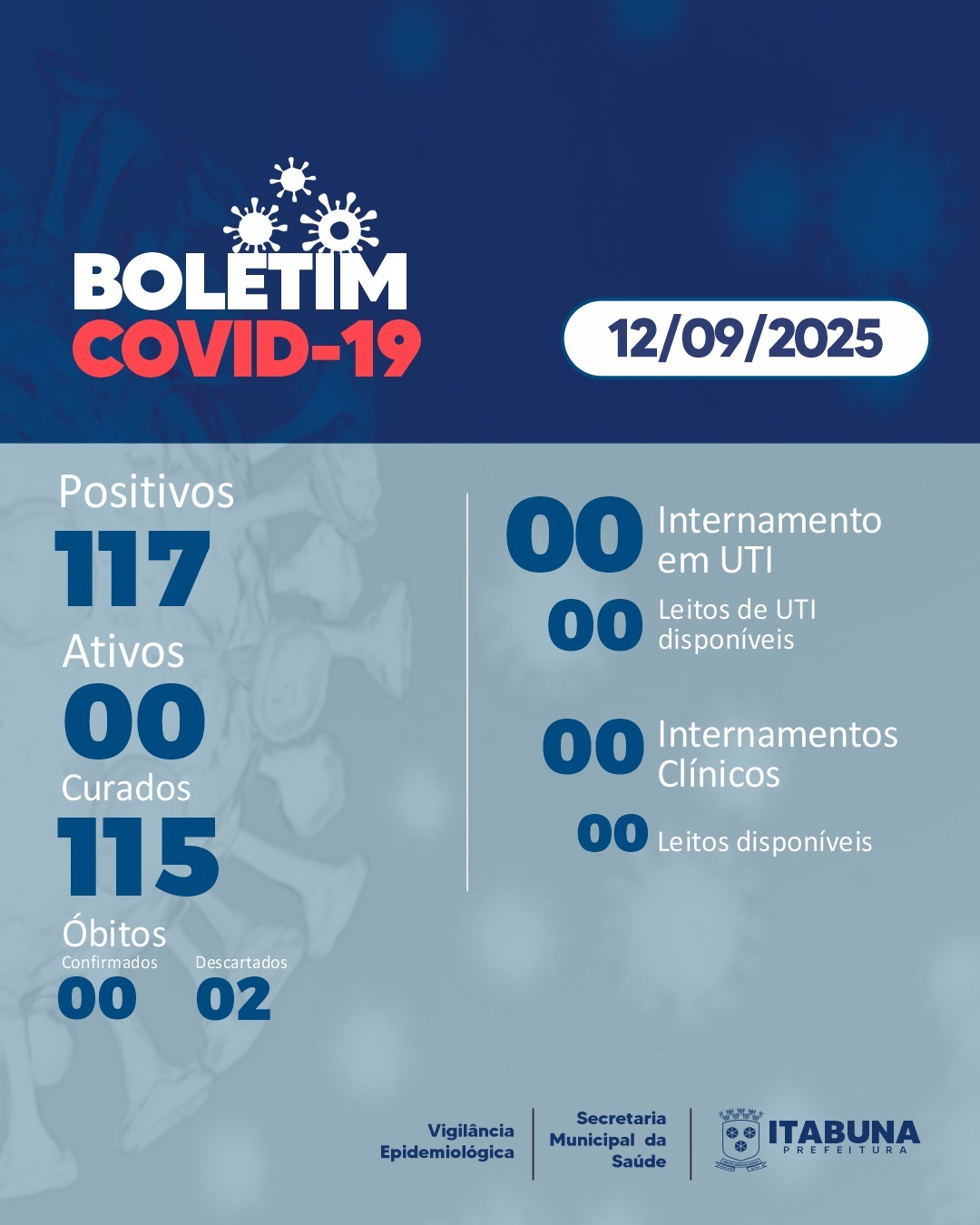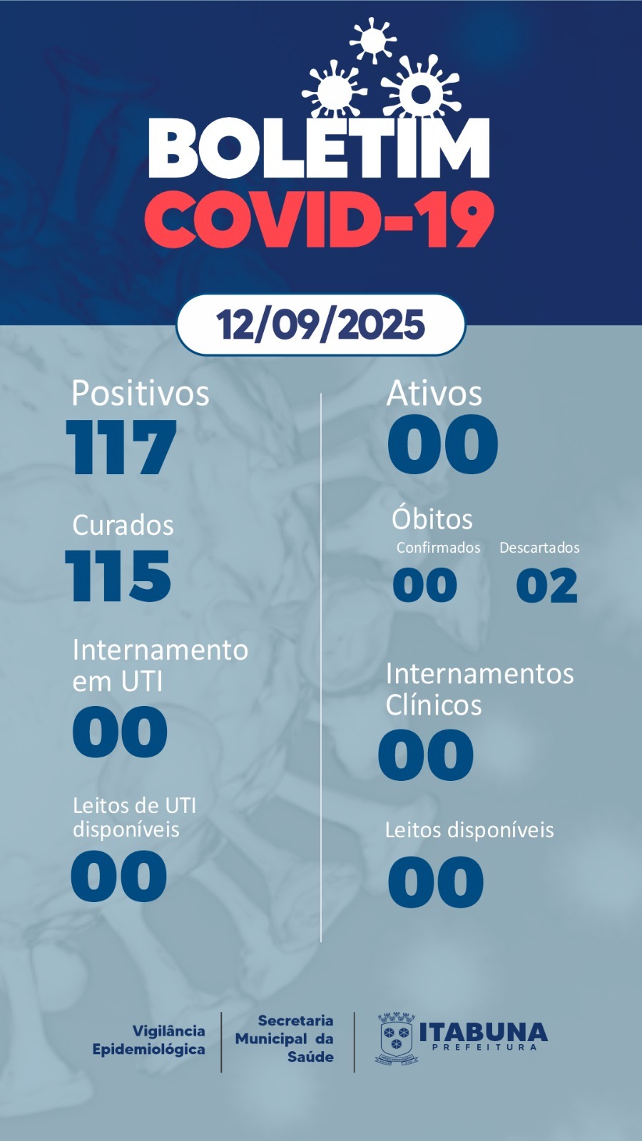 A Divisão de Vigilância Epidemiológica do Departamento de Vigilância em Saúde da Secretaria Municipal de Saúde divulgou hoje um novo Boletim Covid-19 com base na Planilha 2024. De acordo com os dados, Itabuna registra 117 casos confirmados, sendo 115 pacientes curados. O município contabiliza ainda nenhum caso ativo, nenhum paciente internado em leitos clínicos ou de UTI, nenhum óbito confirmado e dois óbitos descartados.