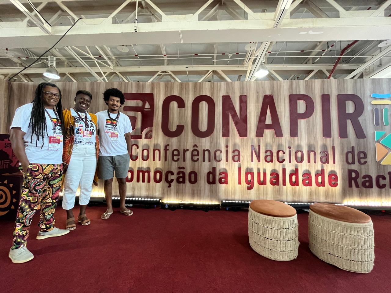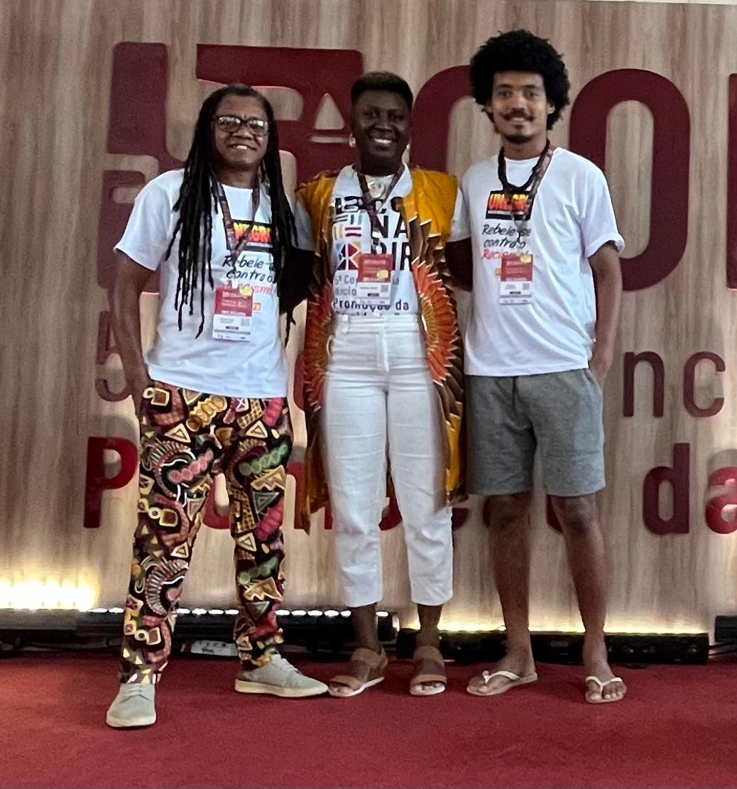 A presidente do Conselho Municipal de Políticas de Promoção da Igualdade Racial de Itabuna (COMPIR), Maria Domingas Mateus de Jesus, e os delegados Egnaldo França e Pedro Jorge representam a cidade e integram os grupos temáticos do Eixo II, Justiça Racial, e do Eixo III, Reparação.