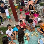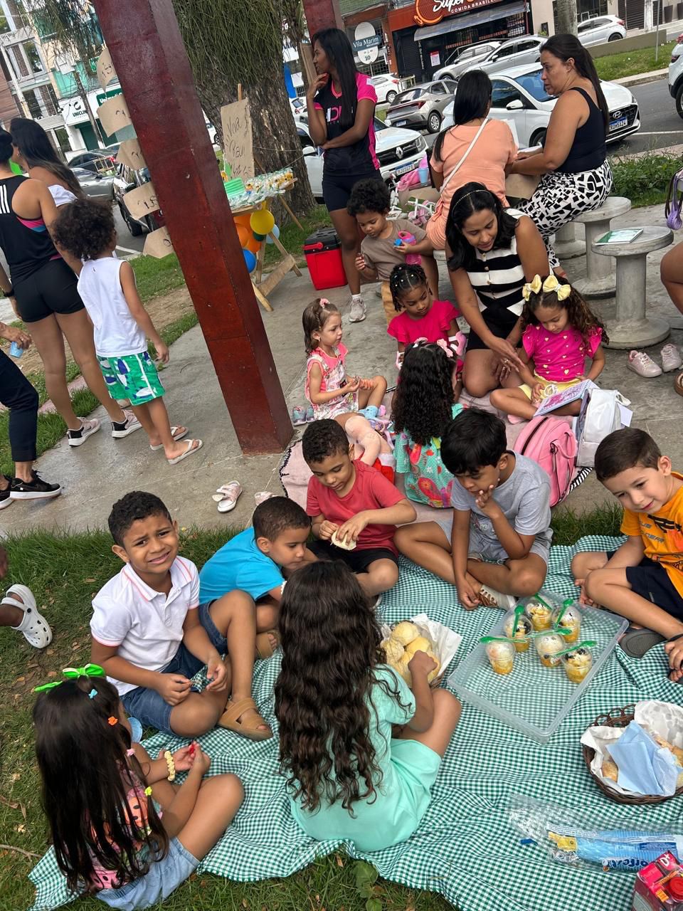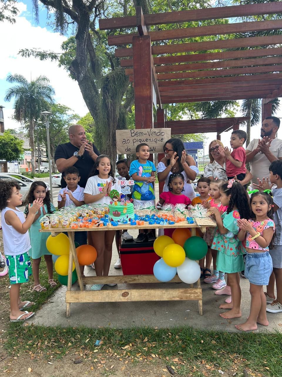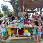 Enquanto os adultos desfrutavam da sombra fresca e boas conversas, as crianças aproveitaram o espaço para brincar, pular, degustar as guloseimas típicas das festas de aniversário infantil.