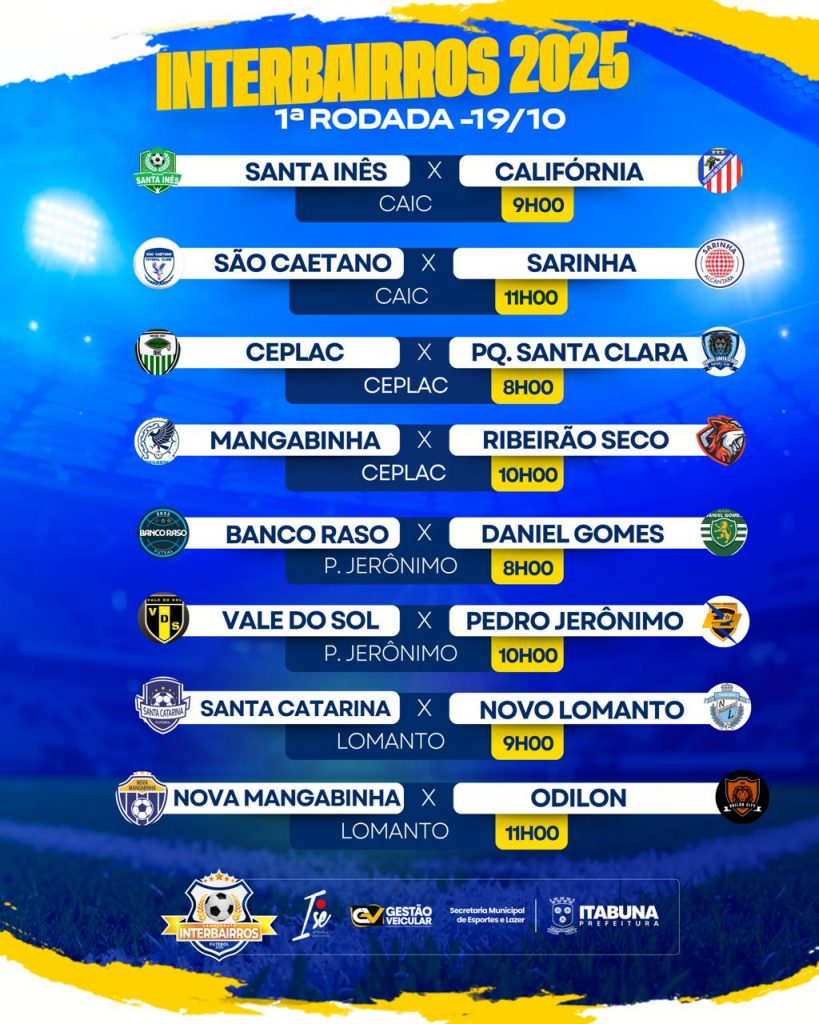 Está tudo pronto para as rodadas de domingo, dia 19, e de segunda-feira, dia 20, inaugurais do 24º Campeonato Interbairros de Futebol de Itabuna promovido pela Prefeitura de Itabuna, por meio da Secretaria de Esportes e Lazer.