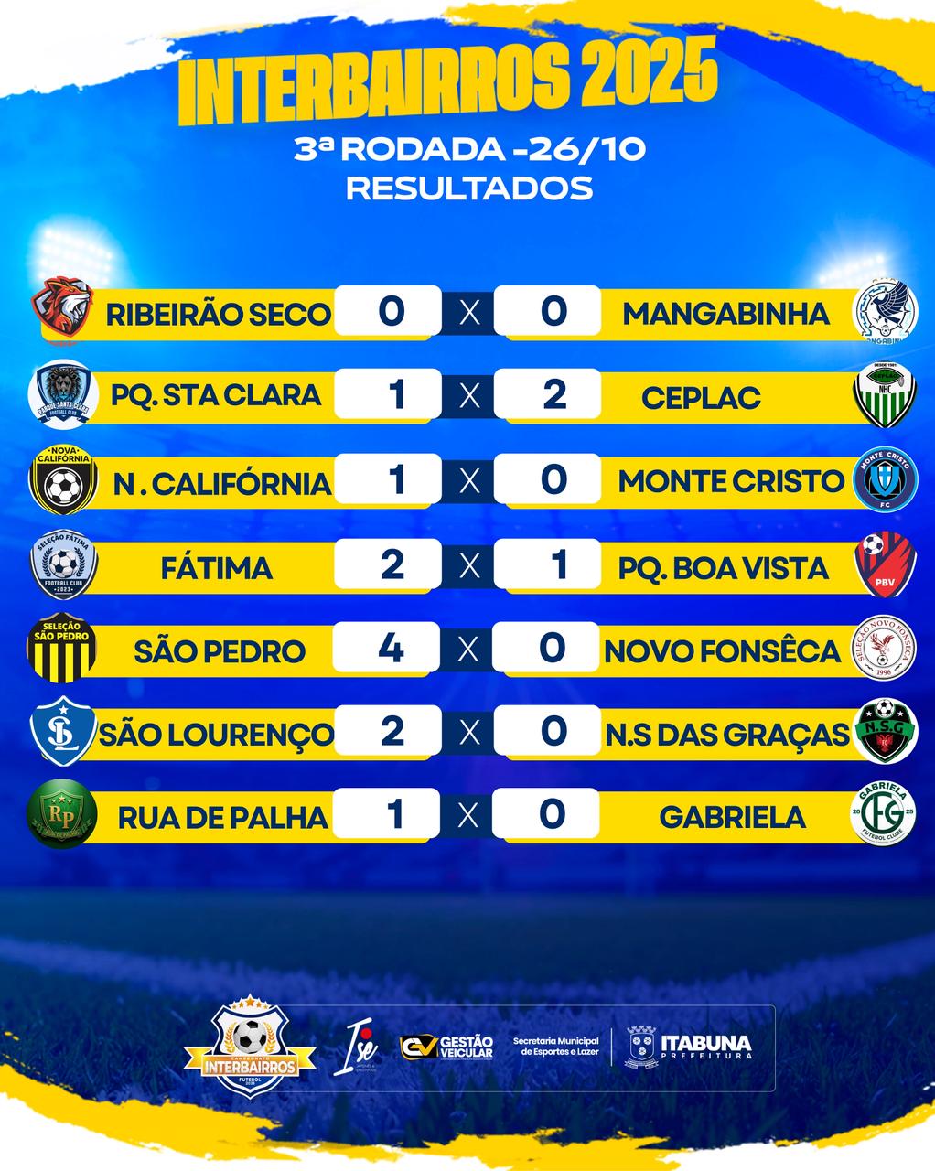 O coordenador do Campeonato Interbairros de Futebol, Gabriel Silva, disse que a maioria dos jogos da rodada foi de volta. “Mas há estreias também. Devido à disposição de campos e datas, a gente está intercalando. Ao final, duas equipes passarão à segunda fase. É bom destacar que o evento é marca consolidada, cria ansiedade nos mais diversos bairros da cidade e onde as pessoas prestigiam suas equipes”, comentou.