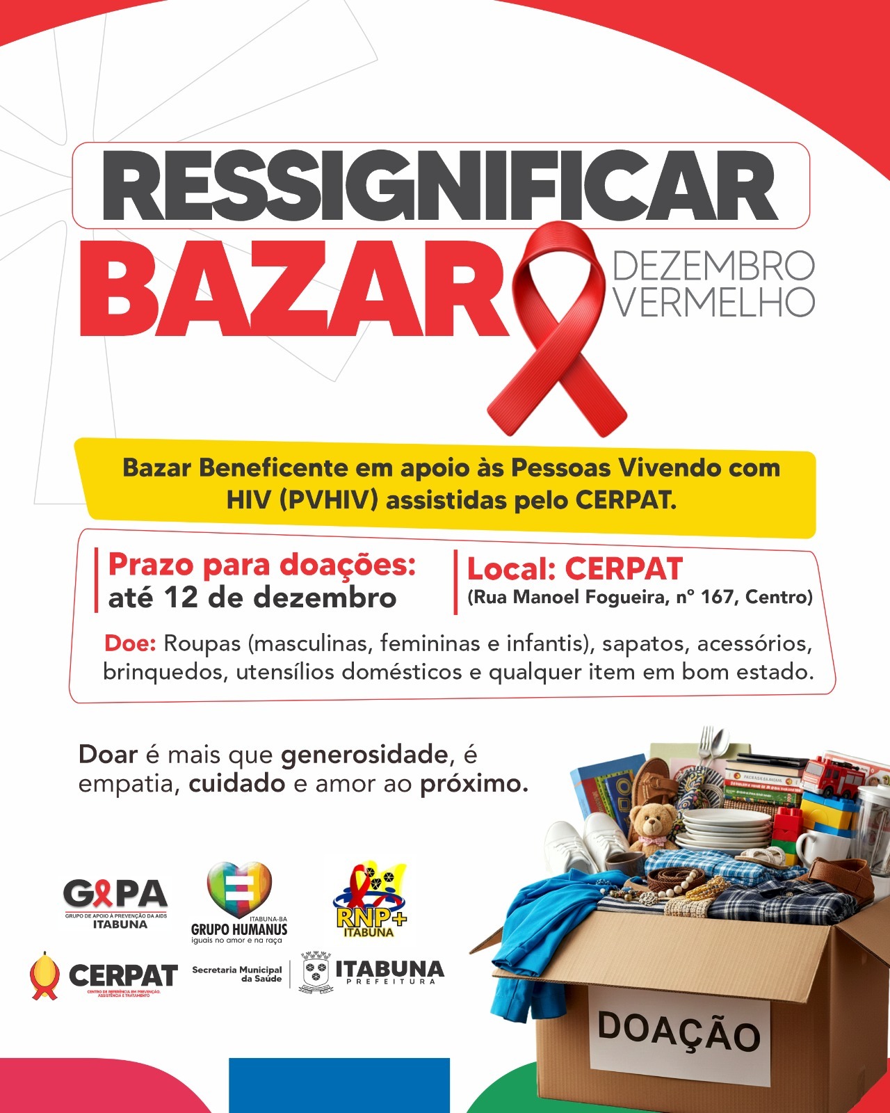 Entre as ações, está o “Ressignificar Bazar”, que será realizado na próxima quinta-feira, dia 17, na sede do CERPAT, no centro da cidade, com o objetivo de doar roupas masculinas, femininas e infantis, além de sapatos, acessórios, brinquedos e utensílios domésticos para as pessoas vivendo com HIV (PVHIV) que são assistidas pela unidade especializada da Secretaria Municipal de Saúde.