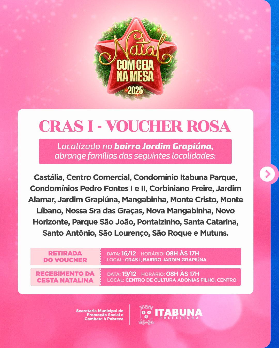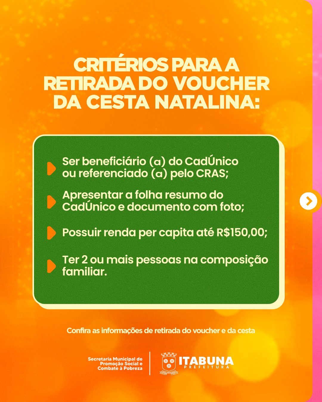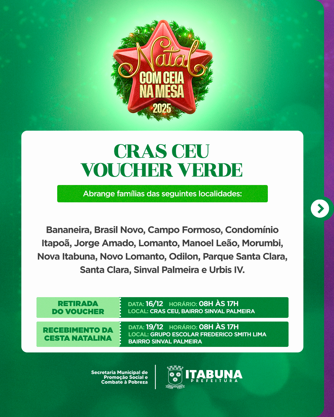 “A entrega dos kits natalinos é ação da Prefeitura de Itabuna, tendo à frente a Secretaria de Promoção Social e Combate à Pobreza, mas com a cooperação e o suporte das demais secretarias municipais, buscando combater a insegurança alimentar e nutricional com foco nas famílias com renda per capta de até R$ 150,00 com mais de uma pessoa por família”, frisou.