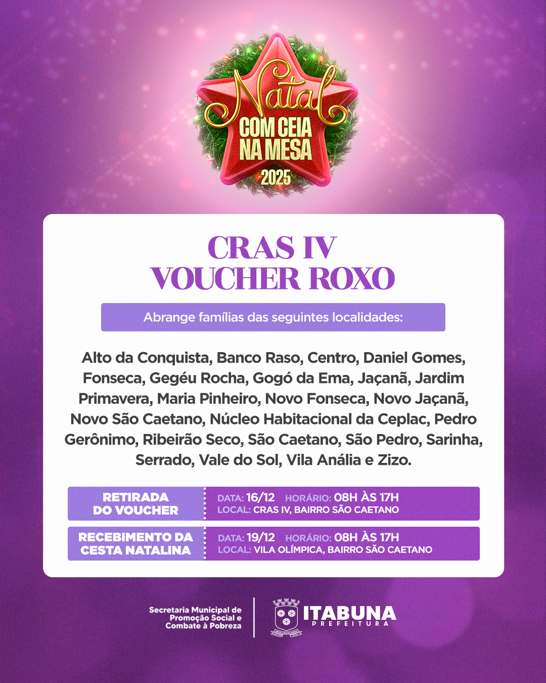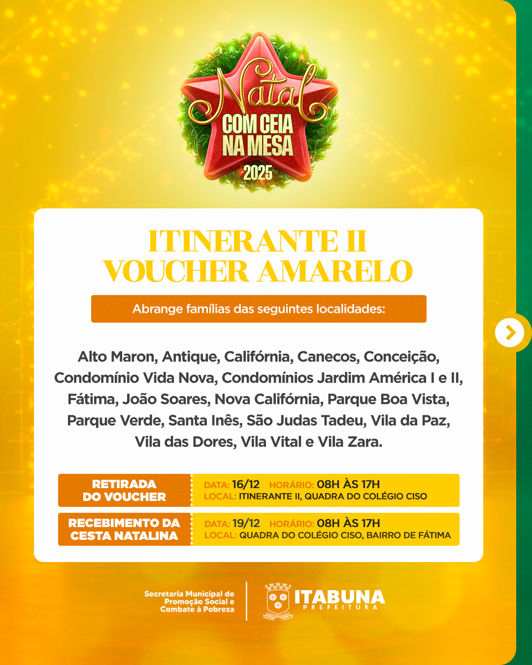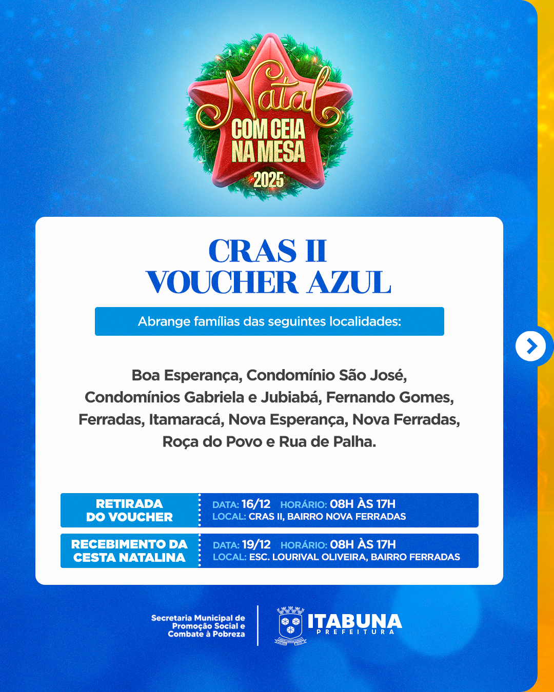 A entrega das cestas natalinas está programada os seguintes locais: Quadra do Colégio CISO, no Fátima; Centro de Cultura Adonias Filho, centro; Vila Olímpica Professor Everaldo Cardoso, no São Caetano; Escola Frederico Smith Lima, no Urbis IV; e Escola Lourival Oliveira Soares, em Ferradas.
