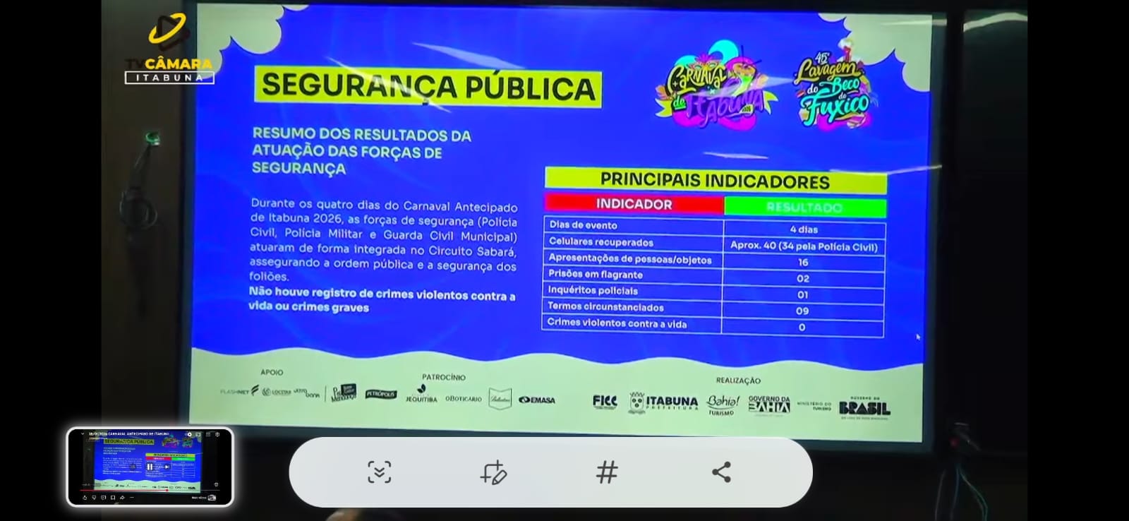 Além disso, informou que o Carnaval Antecipado teve o suporte de um dos três caminhões de videomonitoramento empregado pela Secretaria da Segurança Pública da Bahia, com o auxílio do projeto de utilização de câmaras pela Guarda Civil Municipal (GCM) , que considerou importante.