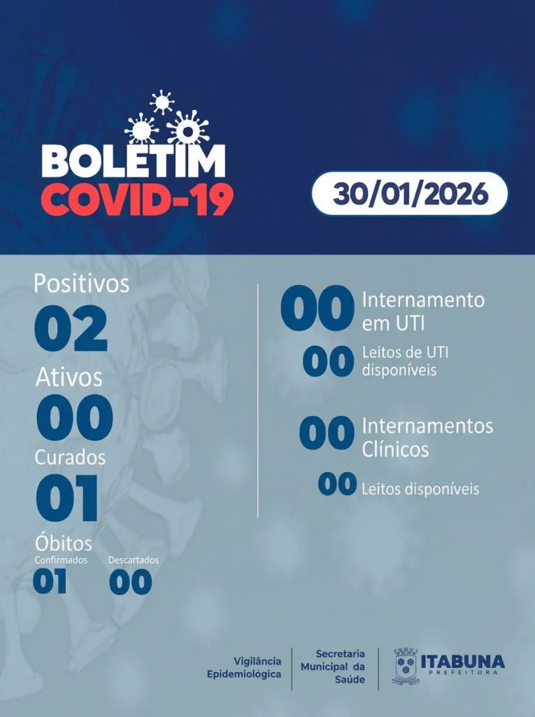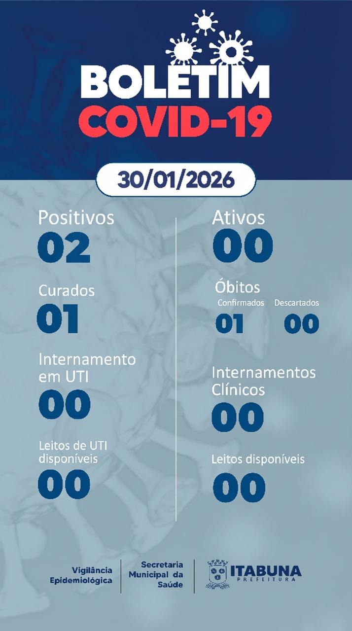 A Divisão de Vigilância Epidemiológica do Departamento de Vigilância em Saúde da Secretaria Municipal de Saúde divulgou hoje um novo Boletim do Covid-19. De acordo com os dados, Itabuna registra 01 paciente curado, 02 confirmados, sendo 00 caso ativo; leitos em UTI ocupados 00; leitos de UTI disponíveis 00; internados em leitos clínicos 01; leitos clínicos disponíveis, 00; óbitos confirmados, 01, e óbitos descartados, 00. Os óbitos inseridos a cada boletim correspondem aqueles que ocorreram em dias anteriores e estavam sob investigação, não tendo, necessariamente, ocorrido nas últimas 24h.